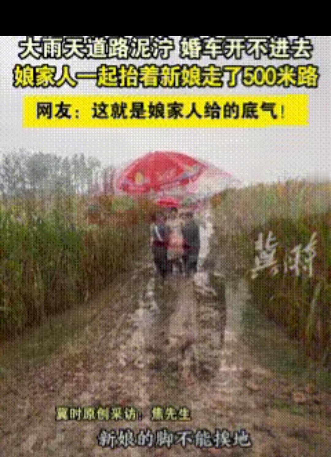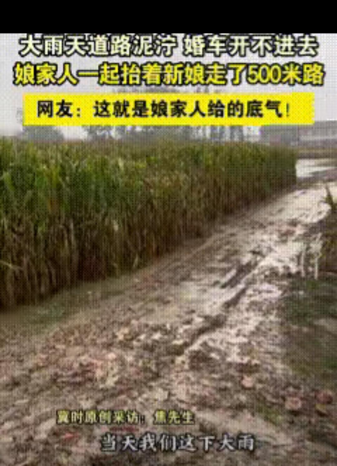 绝了!500米“公主抬”,娘家给的底气太飒 天呐!河南商丘这场出嫁仪式简直绝了!女孩出嫁遇大雨,婚车被阻在500米外的苞米地对面。当地习俗新娘脚不能沾地,还不能走回头路,这可愁坏了大家。 但娘家人就是娘家人,直接几个壮汉齐上阵,把新娘稳稳当当抬过了这500米,送上了婚车。这一幕,接亲的人都看呆了,纷纷感叹娘家给的底气太足。 在我看来,娘家就是女孩一生的后盾,无论何时何地,这份爱和支持都无比珍贵。已婚的女孩们,可别忘了这份恩情,常回家看看。 话说回来,要是你出嫁遇到这种情况,会希望娘家人怎么送你出嫁呢?来聊聊你的想法呀!