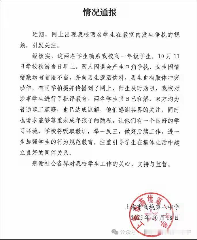 “你知道我爸是做什么的吗”,上海一高中2名学生发生冲突,一女生连泼男生两瓶饮料并叫嚣“没资格和我说话”,校方通报 “你知道我爸是做什么的吗?”这句话,像是一把利刃,瞬间刺破了校园的表面平静。在上海一所高中的教室里,两名学生因为家庭背景的差异爆发了激烈的冲突。这不仅仅是一场简单的争执,更像是一面镜子,折射出当下社会对“身份”、“地位”以及“自我价值”的焦虑与迷失。 事件的起因或许很普通:一场普通的交流、一次误会,或许只是青春期的叛逆,但随着女生的一连串动作——泼了男生两瓶饮料、叫嚣着“没资格和我说话”,整个场面瞬间失控。那一刻,校园变成了战场,也让人不禁反思:我们的教育,是否真的在引导学生学会尊重与理解?还是在无形中,助长了那份“我比你高一等”的优越感? 更令人心痛的是,事件发生后,校方的通报似乎像是一份“官方声明”,试图平息事态,却难以抚平公众的情绪。有人说,这只是个别学生的行为,有关部门的处理也只是“教育引导”。但深层次的问题呢?我们是不是太过关注“表面”的矛盾,而忽视了背后那片迷茫的青春心灵?是不是在某种程度上,我们也在无形中灌输了“阶级”与“身份”的标签,让孩子们在成长的路上变得愈发焦虑和敏感? 其实,这个事件的背后,是社会价值观的缩影。我们生活在一个信息爆炸、价值多元的时代,孩子们面对的压力比任何时候都大。家庭的期待、学校的竞争、社会的评判……都在无声中塑造着他们的认知。有人说:“你父亲做什么,和你是谁,有关系吗?”但在现实中,这句话似乎变得越来越难以成立。身份感、归属感,成为他们在成长路上最渴望的东西。 我们不能只把责任推给孩子,也不能只责怪学校。或许,我们更应该反思:我们是否在无意中制造了一个充满偏见和阶级的社会?我们是否在无形中教会了他们,用标签和优越感去衡量别人?这场校园冲突,提醒我们每个人都应成为那个传递正能量的人——用理解和包容去打破偏见,用尊重和善意去化解冲突。 因为,真正的强大,不是站在高处指责别人,而是懂得在纷繁复杂中,依然保持一颗平和的心。让我们从这起事件中汲取教训,不仅仅是对两个学生的关切,更是对整个社会价值观的深刻反思。或许,只有当我们学会真正理解彼此,才能让这个社会变得更加温暖和包容。对此,你有什么看法。咱们在评论区交流高中生怒斥父母 高三怒怼
