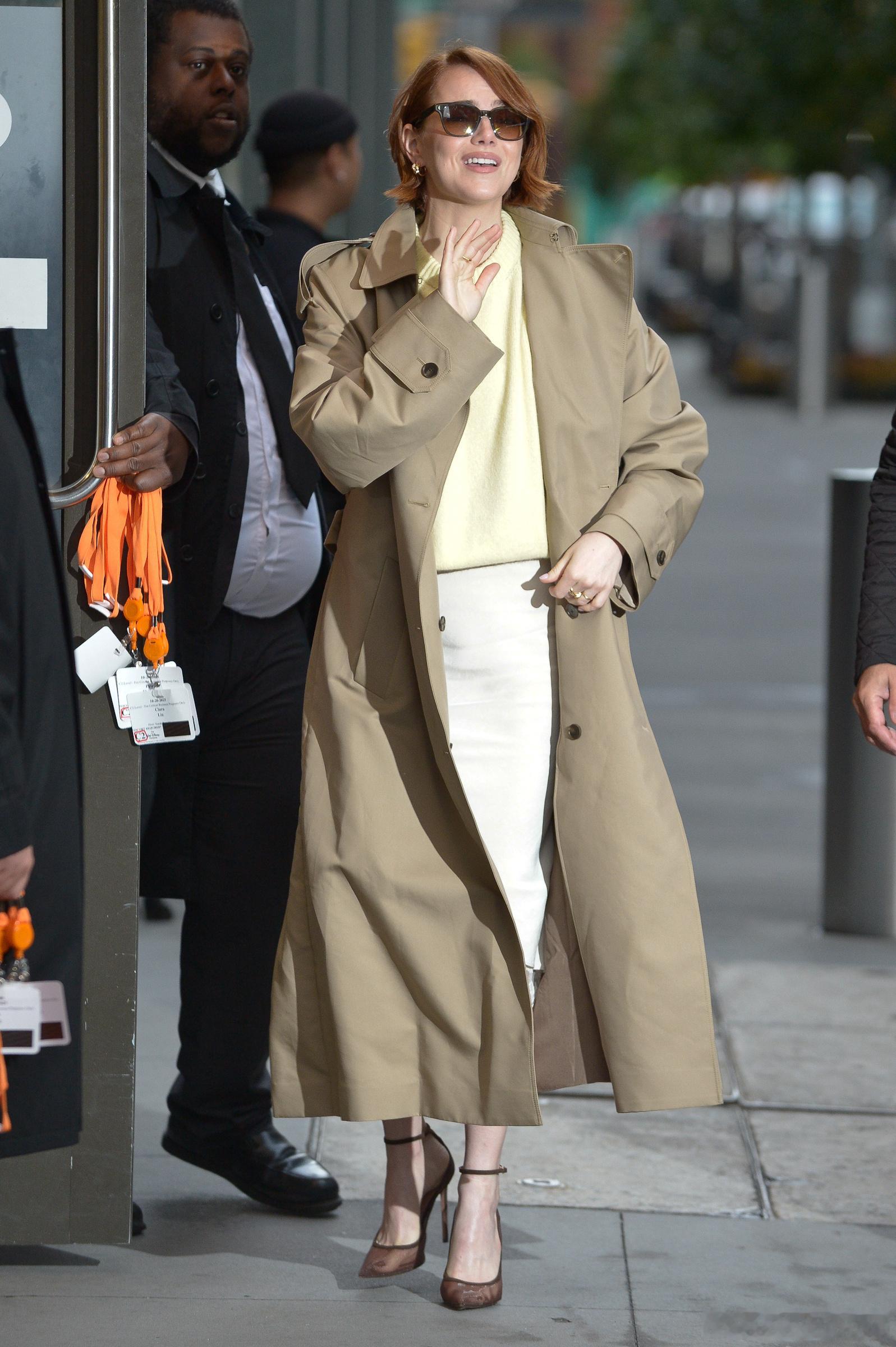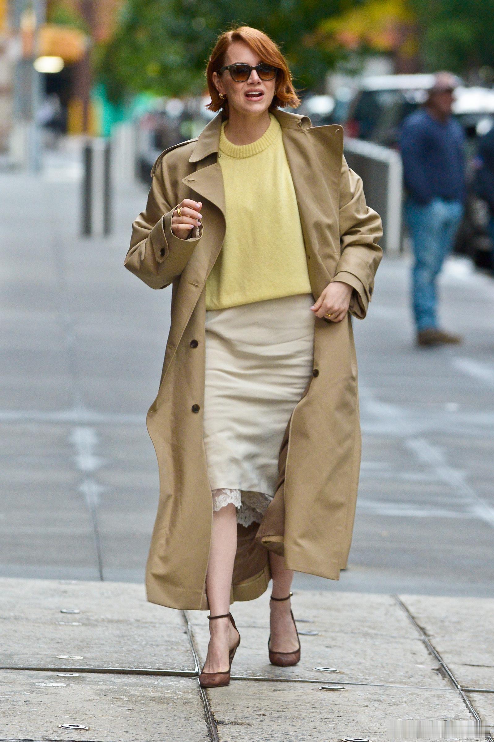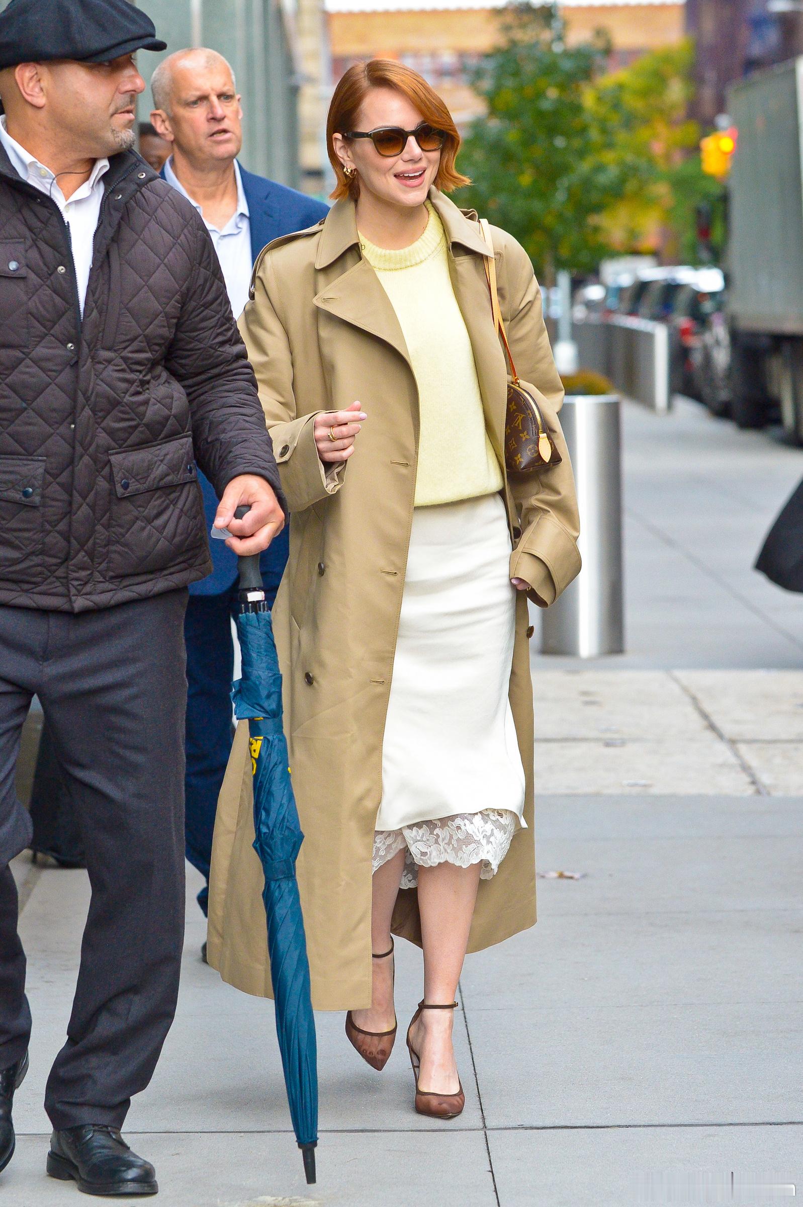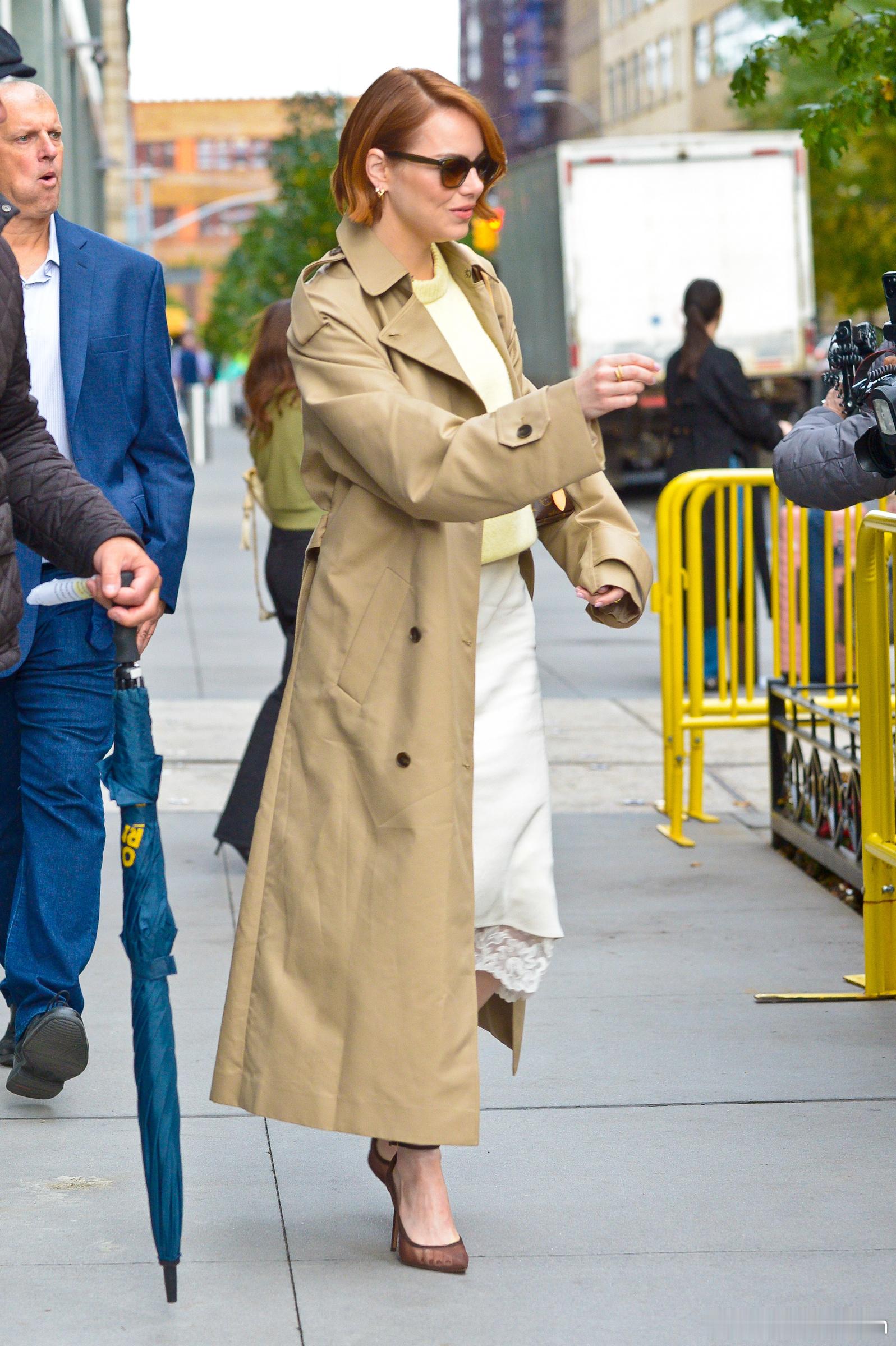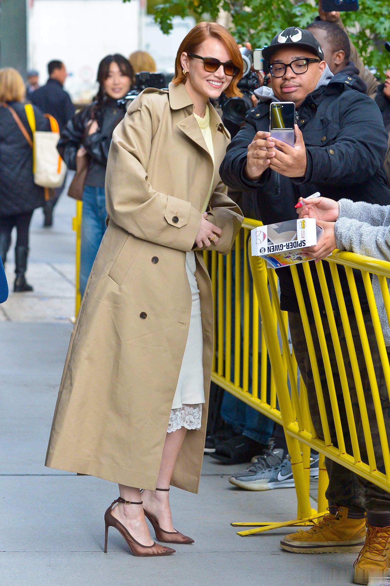 Emma stone艾玛斯通在纽约外出,忙着新片《Bugonia》宣传的石头身着风衣脚踩透视高跟鞋离开《GMA》的录制现场 ​​​