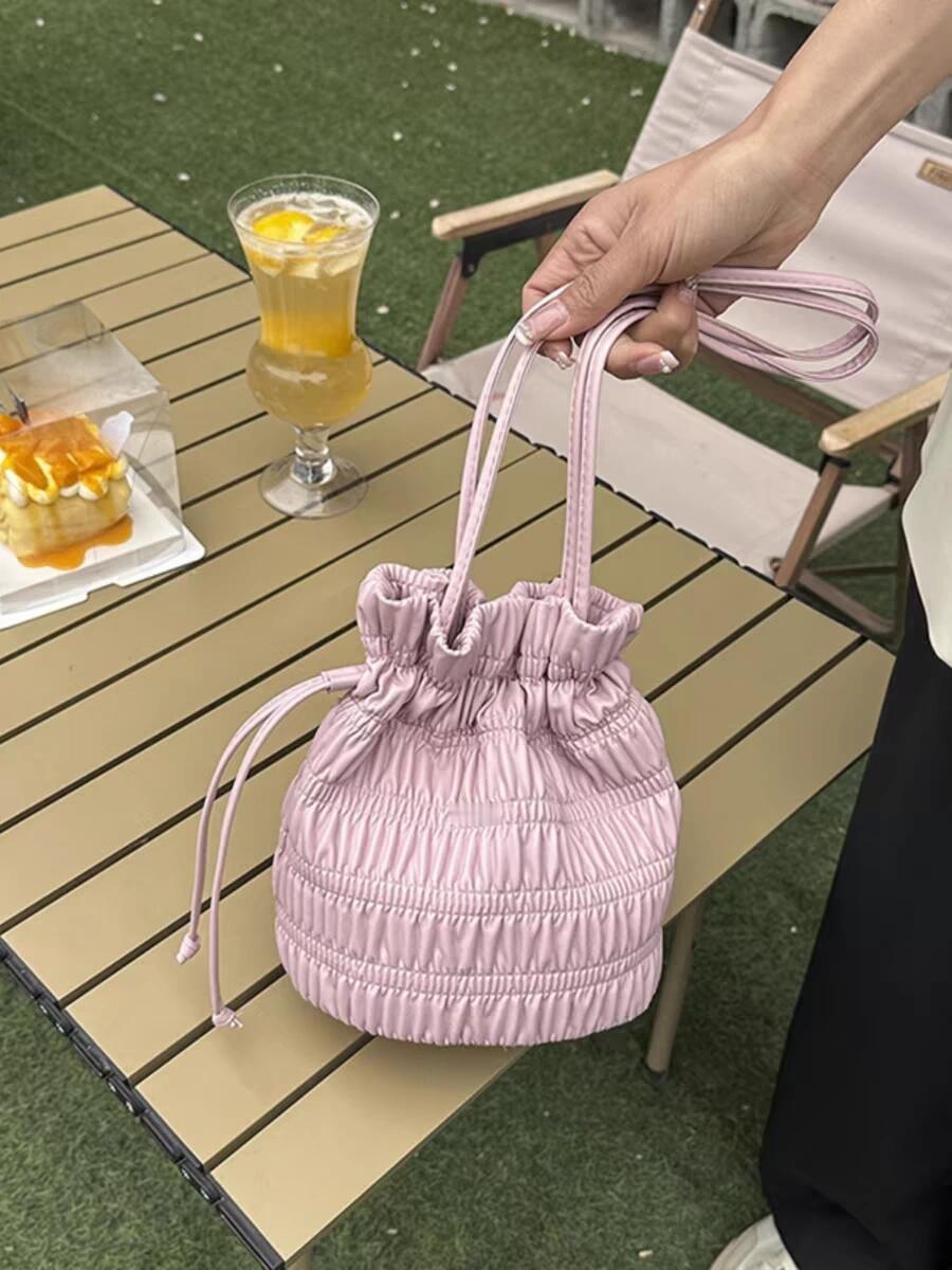 这个粉色褶皱水桶包堪称夏日宝藏单品,柔雾粉调温柔甜美,褶皱面料质感高级又小众,腋下单肩背,利落精致。包身容量足够装下手机、补妆品等日常好物,轻盈不压肩,适配约会、通勤、上课等多种场景,既是穿搭加分项,也是拍照出片的吸睛利器,实用又好看