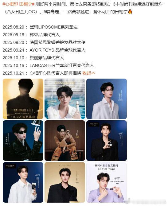田栩宁2个月7个商务,势不可挡的田栩宁,咱就说就样一步一个脚印,代言和商务都吻上这个阿栩,期待住接下来能够和你的多多见面,我们商务官宣见~
