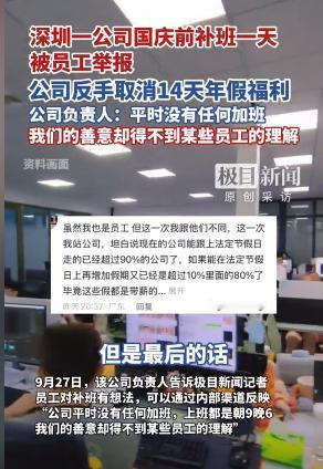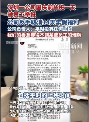 “偷鸡不成蚀把米!”9月27日深圳市某公司因前期台风放假导致工期延误,遂要求员工在27日补班一天,此举却引发员工不满,并向劳动部门投诉。面对投诉,公司虽同意27日不再调班,却决定调整放假制度,取消员工的14天年假福利及其他所有额外假期。不难推测,那位举报公司加班的员工,恐怕已难在公司立足,一旦其离职,公司极有可能立即恢复原有的假期福利。[作揖]   深圳疆拓商贸公司近日因台风停工引发后续风波,9月底受台风影响,公司安排23、24日两天带薪休假,未要求居家办公。 临近国庆为处理积压订单,公司决定9月27日周六补班一天,以避免违约。 不料有员工向劳动监察部门投诉,认为调休影响休息,监管部门介入后,公司随即调整安排,宣布27日正常放假。 但通知后半段内容令员工意外,公司决定将原本14天的年假缩减至法定标准,并取消所有额外假期,如抗战胜利纪念日半天假、万圣节与圣诞节各半天假,以及年底两周长假。 公司负责人表示,此前一直实行朝九晚六不加班,台风天也主动带薪放假,如今因补班取消叠加国庆假期,货物预计延迟10天发出损失较大。 他对员工不先内部沟通而直接投诉感到不解,认为一天补班本可协商解决,不必闹至劳动局,不少老员工当初正是看中公司的额外假期福利。 这件事被发到网上后,立刻炸开了锅,网友们的看法也是两极分化。 “这老板也太狠了,一人犯错全员连坐,直接取消全年福利,这分明是杀鸡儆猴啊,以后谁还敢提意见。” “站公司这边白给两天台风假还不知足,仓库都要爆仓了,补一天班怎么了,现在好了全公司跟着倒霉。” “举报的员工也是愣头青,有事不能先内部说吗,直接捅到劳动局,把路都走死了,以后在公司怎么混。” “说风凉话的肯定不是员工,周六临时调班打乱多少计划,医院预约、亲子活动全泡汤,维权还有错了。” “神仙福利本来就是额外恩惠,公司却拿来当筹码,今天能取消福利,明天就能干更绝的事寒心。” “两边都有问题,公司沟通太粗暴,员工维权太激进,最后双输,典型的职场沟通反面教材。” “14天年假啊,我们公司年假5天都抠搜的,真是身在福中不知福,不要这福利可以转让给我们。” “台风假是全市规定,又不是公司单独给的恩惠,拿这个道德绑架员工加班,才是偷换概念吧。” “经历过类似的事,老板总觉得给点甜头就能让员工无限让步,一旦较真就翻脸太真实了。” “支持举报很多公司就是被惯坏的,总觉得员工该感恩戴德,依法维权才是正道的光。” “作为HR说句实话,这种报复性调制度涉嫌违规,劳动法规定修改制度需协商,不是老板一句话的事。” “年轻人整顿职场,整顿到最后把自己和同事的福利都整没了,理想很丰满现实骨感啊。” “关键看公司平时怎么样,要是总突然调班,这次就是压死骆驼的最后一根稻草,不能光看这一件事。” “我们公司上次台风也让补班,但提前两周征询意见,80%同意才执行,沟通到位根本不会闹这么大。” “最惨的是沉默的大多数,莫名其妙少了半个月假期,找谁说理去,真是人在工位坐,锅从天上来。” 你觉得这件事谁的问题更大?如果你是这家公司的员工,会怎么处理?欢迎在评论区说说你的看法。   信息来源:央视网2025-09-28发布:台风后补班被员工举报,公司取消14天年假,这场矛盾的症结在哪里?