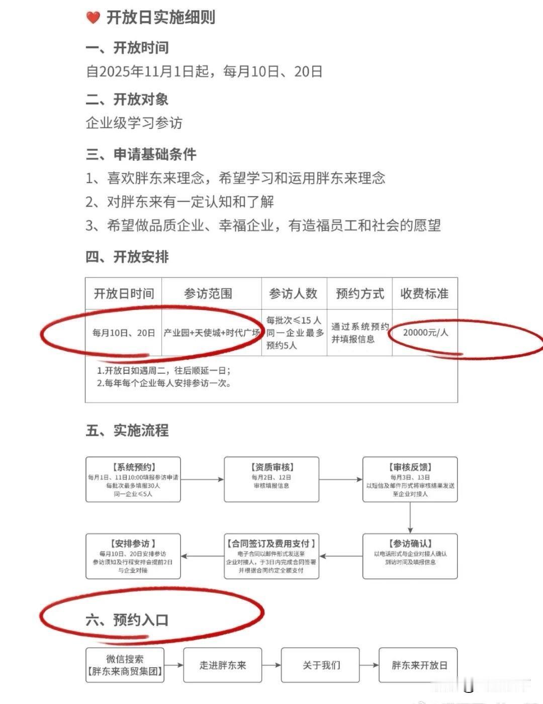 花2万块钱参观胖东来你去吗?从2025年11月1日起的每月10日、20日为胖东来开放日,每人交两万块就可以参访产业园、天使城、时代广场,参访人数每批次不超过15人,同一企业最多可预约5人。 参访的企业需要通过线上预约和资质审核,预约通道定于每月1日和11日上午10点开启,胖东来将对报名企业进行审核,每人每年仅有一次参访机会。 有网友表示这不比参加什么成功学大师的课好多了,人家胖东来是实实在在的成功,而且只收2万块,比成功学大师的课便宜多了,相信应该会有不少人报名去参观的[笑哭][笑哭]