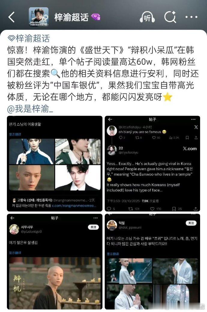 梓渝在韩网被称为寺庙车银优韩网热议梓渝 梓渝为《盛世天下》剃发饰 “辩积”,韩网友赞 “寺庙车银优”,几分钟戏份成热议焦点。