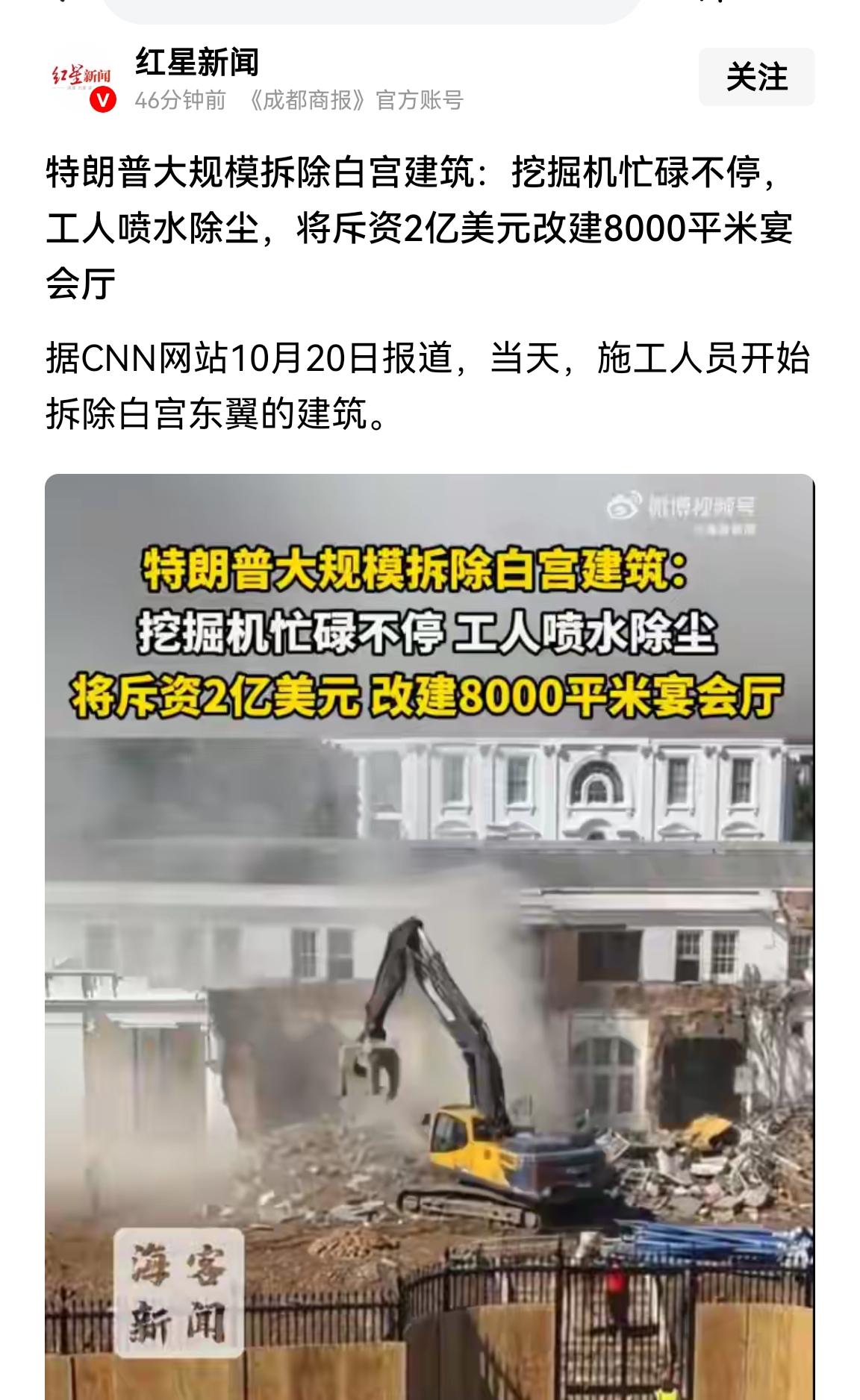 老美媒体抱怨“白宫”居然成了一个大工地,每天都是拆改重建。 我国网友绝妙调侃,这非常符合房地产商的一贯风格。 继花园改造后,老特现在又开始对白宫建筑动手了。 现在机械进场拆除东翼房屋,准备花费15亿人民币左右建设一个约8300平米的宴会厅。 不出所料的话,老特将夺取又一个历届总统之最---最什么就有网友来取名吧。[狗头][狗头]