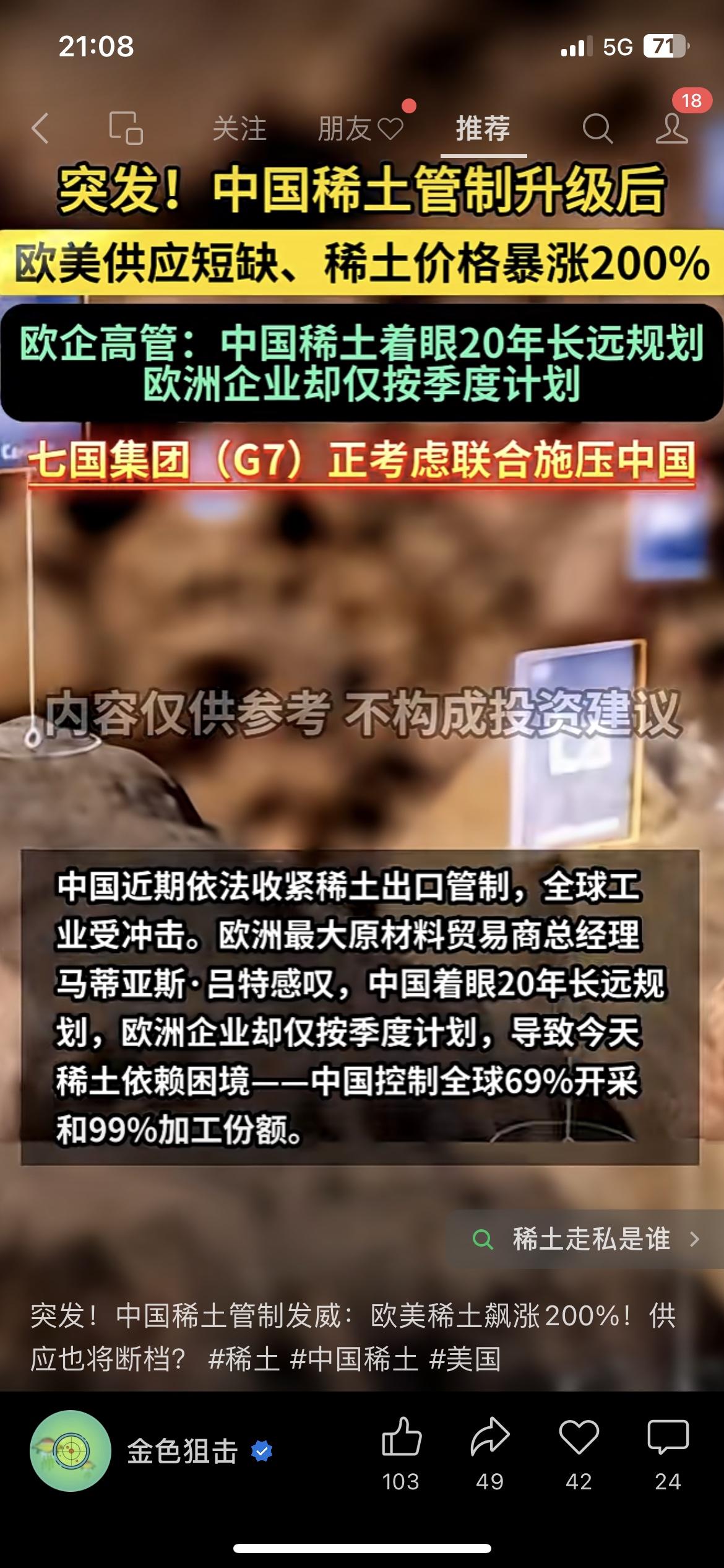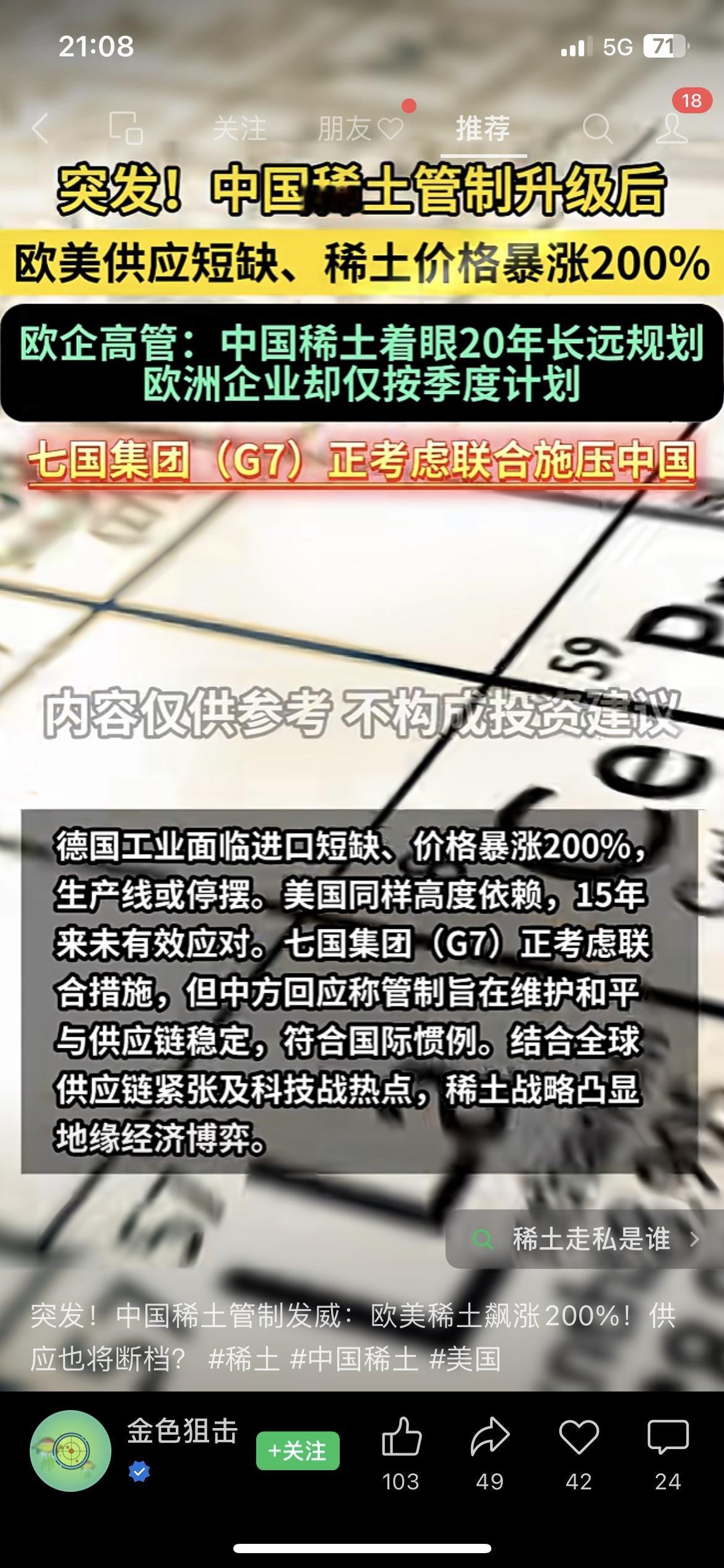 🔥中国稀土管控再升级!全链条管制覆盖技术与境外产品,欧美产业链承压明显! 刚传来消息,商务部10月又加码稀土管制,不仅把开采、冶炼技术全纳入管控,连境外含0.1%中国成分的相关产品出口都要许可,直接构建了全链条管控网。这波操作下来,国际市场反应立竿见影——镝价已涨超210%,欧洲车企被迫调整产线,不少依赖稀土的高端制造产能都卡了壳。 有行业人士直言:中国早不是只看短期收益,从稀土精矿连续五个季度涨价(累计涨幅超56%),到掌握全球69%的开采量、90%以上的冶炼份额,这布局根本是着眼产业链话语权。反观欧美,之前对供应链风险重视不足,现在想联合应对也绕不开咱们的技术壁垒。 不过要说明的是,咱的管制并非一刀切,民用合规申请都能批,核心是守住战略资源安全底线。这波稀土博弈,本质是从“卖资源”到“定标准”的转型,全球产业链都在适应新规则! 稀土 中国稀土 财经热点 产业链升级 稀土出口限制 中国对美稀土