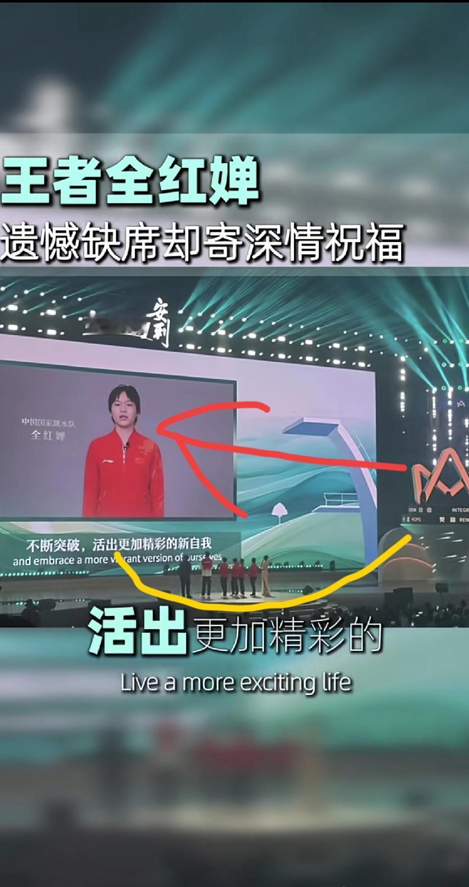 全红婵果然是走到哪里都受人欢迎! 怕是不能亲临现场,只是放一个影像都会引起台下的观众们都会欢呼雀跃,因为她这一次要在广东队康复训练,为全运会做准备。所以给国家队就,指派了陈芋汐跟陈艺文等队员来参加这个活动。 你出现场都是一片安静,记者跟粉丝们也都提了问,可是有人问到主持人全红婵怎么没来? 随后面就插播了一条全红婵的录屏,顿时现场尖叫声,欢呼声不绝于耳。 所以她即使没来,粉丝们都没有忘记全红婵!