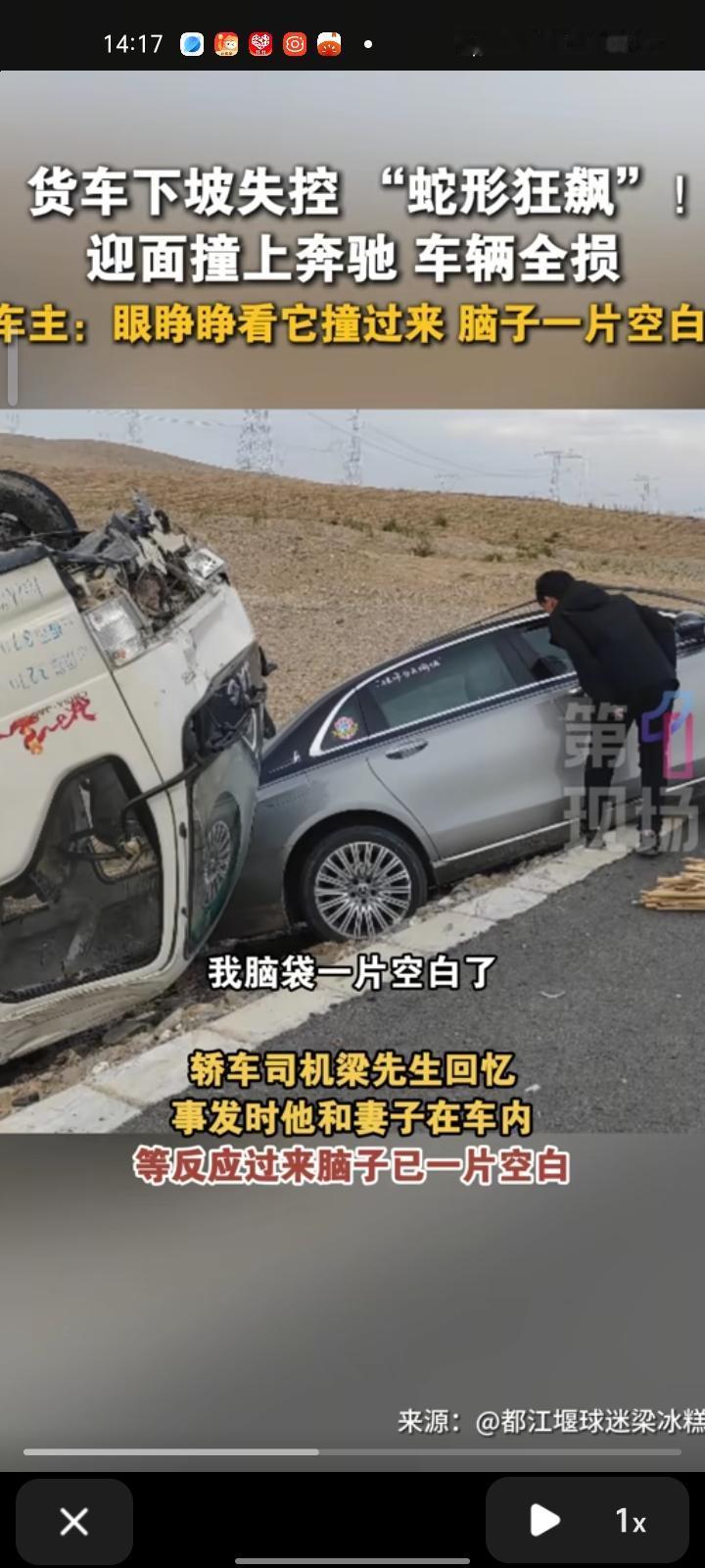 10月16日,海南州共和县。货车下坡失控上演“蛇形狂飙”,撞上正常行驶的轿车。车主梁先生回忆,事发时他和妻子在车内,等反应过来时脑子一片空白。他表示,多亏了安全气囊,车上的人受轻伤,车子走全损