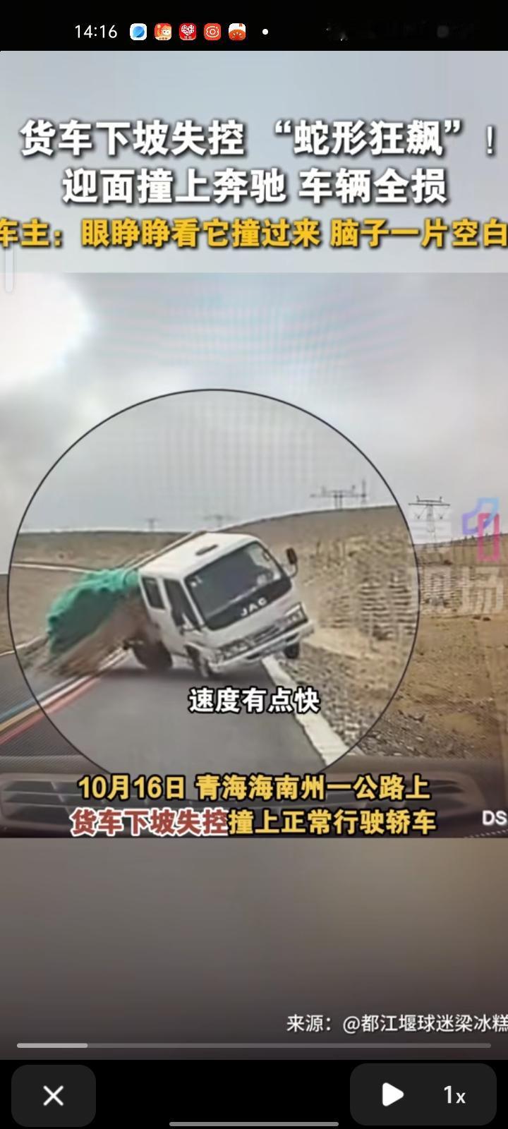 10月16日,海南州共和县。货车下坡失控上演“蛇形狂飙”,撞上正常行驶的轿车。车