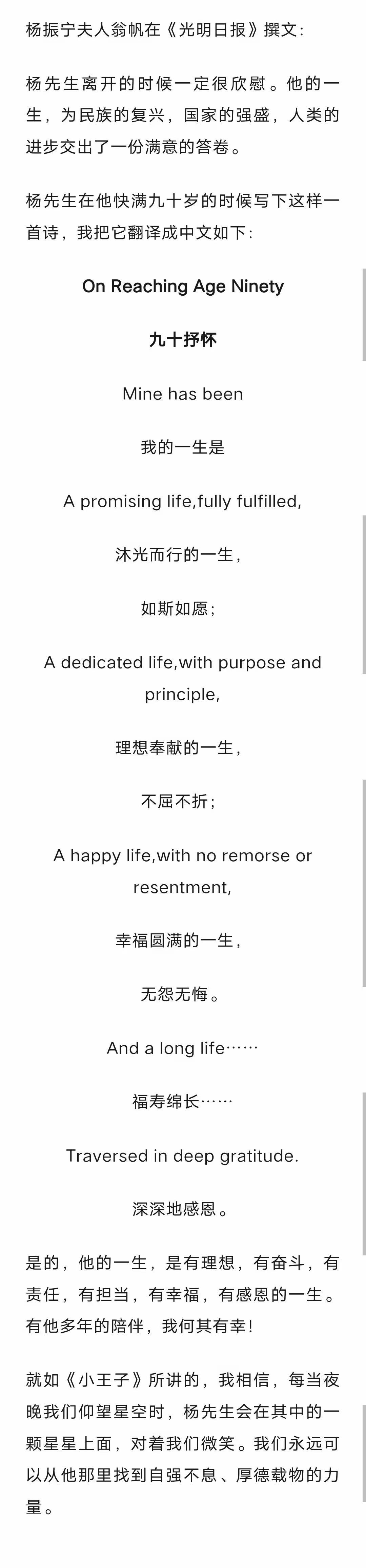 翁帆的这篇悼文,倒是简短而不失深意。说实在的超出了想象,本以为是要发万字长文的。 倒不知怎的,却想起了陆小曼:徐志摩驾鹤后,陆小曼花了很长一段时间整理徐志摩的文稿,也算为后世留下了点什么。 陆小曼是饱受非议的,翁帆也差不多吧。设身处地,翁帆所受的非议可能不比陆小曼少。心理承受能力也应该比陆小曼强。 从这篇短小的悼文,可见翁帆确有过人之处,且比较清醒。 翁帆的悼文刊发在《光明日报》上,标题《他交出了一份满意的答卷》,全文不足三百字。字字落在杨振宁的一生功业上,没有半句个人悲戚。 她引用杨振宁九十岁时的诗作,翻译成“沐光而行、理想奉献”的字句。这份理解,早已超越普通伴侣间的温情,直抵灵魂深处的共鸣。 陆小曼当年整理文稿,带着半生愧疚与思念,字句间都是个人情殇。翁帆的文字却克制而开阔,着眼于民族复兴与人类进步,格局立见高下。 2004年那场相差54岁的婚姻曝光,恶意揣测铺天盖地。有人说她图名图利,有人编派各种不堪谣言,网络上的恶评持续了十几年。 她从未公开辩驳过一句。清华园的“归根居”里,她把日子过成了对非议最有力的回应。杨振宁百岁摔倒住院85天,她守在床边,见客超一小时就坚决终止。 杨振宁102岁时,两人庆祝结婚20周年。老先生写毛笔字时,会转头亲昵地叫她“Darling”,她则在旁轻声转达宾客的提问,默契得像相处了一辈子。 那些年,杨振宁的学术活动从未间断,背后全是她的细致照料。帮他核对文献、整理资料,连出席活动的衣着搭配都考虑得妥妥帖帖,成了他离不开的“眼睛和耳朵”。 杨振宁曾公开说,翁帆是“上帝给我的最后一份礼物”。这份评价不是空话,是20年朝夕相伴里,无数个温暖瞬间堆出来的信任与依赖。 陆小曼当年活在舆论的漩涡里,最终沉溺于烟酒,消磨了才情。翁帆却在非议中保持着清醒,把生活重心放在照料杨振宁与精神共鸣上,活得从容而坚定。 悼文里那句“有他多年的陪伴,我何其有幸”,道尽了20年相伴的真谛。没有委屈,没有炫耀,只有发自内心的感恩,这份通透太难得。 她还提到了《小王子》,说仰望星空时能看到杨振宁的微笑。用诗意的想象消解悲伤,既保留了温情,又避免了沉溺,这份豁达让人敬佩。 外界总好奇他们的相处模式,却忽略了最本质的东西。杨振宁需要的是灵魂契合的陪伴,翁帆追求的是精神世界的丰盈,这份供需平衡无关年龄。 朱邦芬院士曾说,翁帆把杨振宁照顾得无微不至。这种照顾不是简单的衣食起居,更包括守护他的学术生命与精神尊严,这才是最长情的告白。 陆小曼的故事里藏着遗憾,翁帆的岁月中写满圆满。前者用余生赎罪,后者用时光证爱,不同的选择,走出了截然不同的人生轨迹。 那些曾经嘲讽翁帆的人,在20年的时光面前渐渐沉默。当陪伴成为常态,当温情看得见摸得着,任何恶意揣测都显得苍白无力。 悼文里没有个人恩怨,没有外界纷扰,只聚焦于杨振宁的“理想与担当”。这恰恰是对逝者最好的告慰,也是对自己20年付出最体面的注解。 翁帆用一篇短文证明,最深的怀念从不是长篇大论的哭诉。把爱人的一生功业记在心里,把共同的温暖藏在回忆里,才是真正的情深意重。 她或许不会像陆小曼那样整理文稿传世,但她用20年光阴,守护了一位科学巨匠的晚年。这份付出,比任何文字都更有力量,更值得被铭记。 如今杨振宁离去,翁帆的平静与清醒,正是这段感情最好的收尾。那些非议终将消散,留在岁月里的,是跨越年龄的陪伴与尊重。杜致礼翁帆之恋 杜致礼翁帆情缘 麻烦看官老爷们右上角点击一下“关注”,既方便您进行讨论和分享,又能给您带来不一样的参与感,感谢您的支持! 各位读者你们怎么看?欢迎在评论区讨论。
