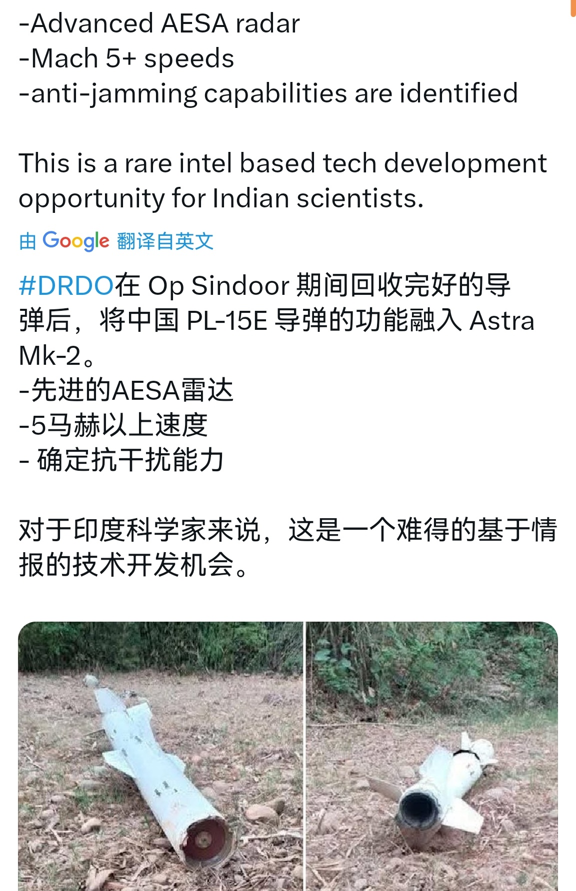 🔻印度DRDO(印度国防研究与发展所)也真是幽默,拿着个PL15E残骸就说要山寨技术。