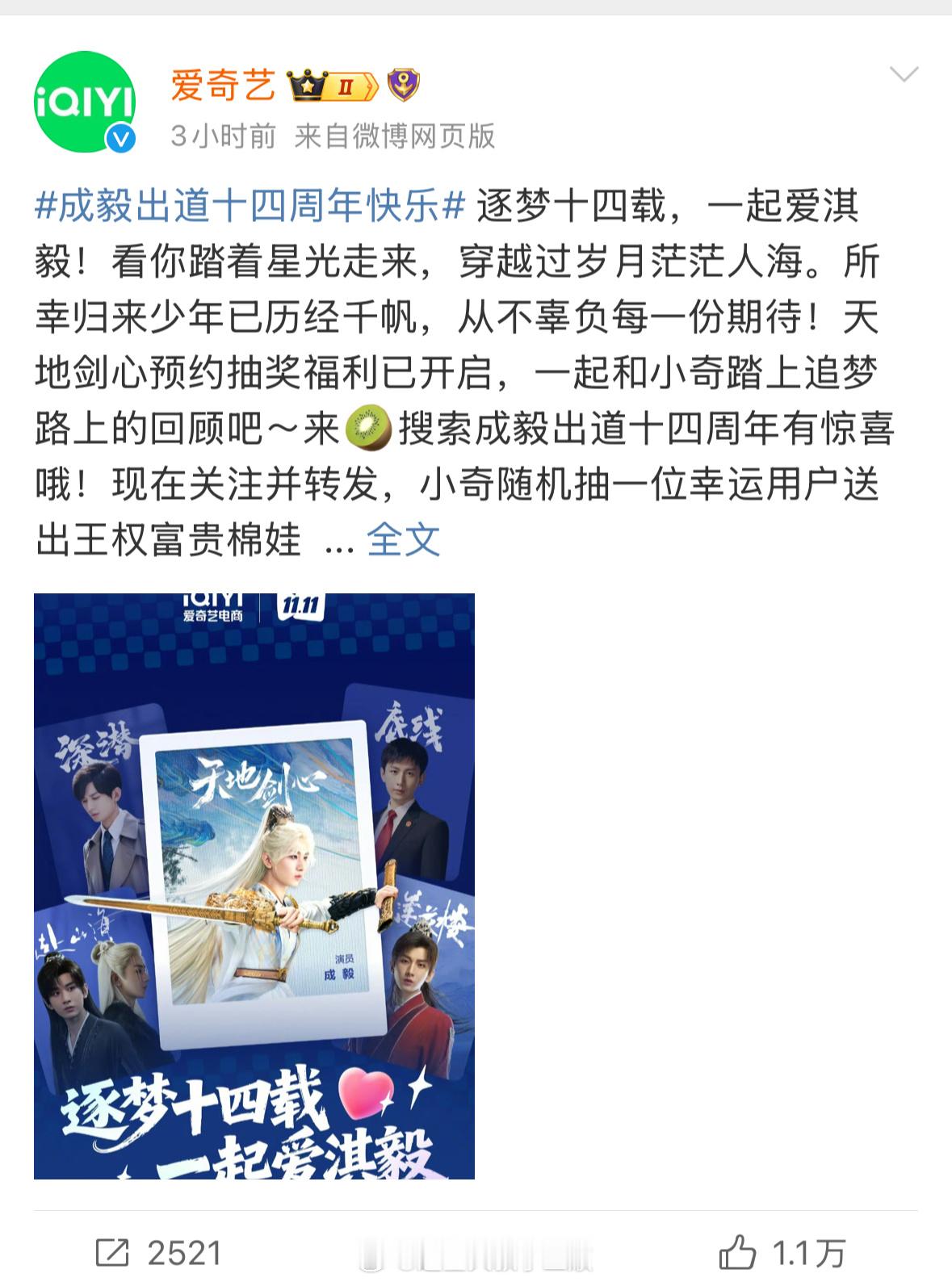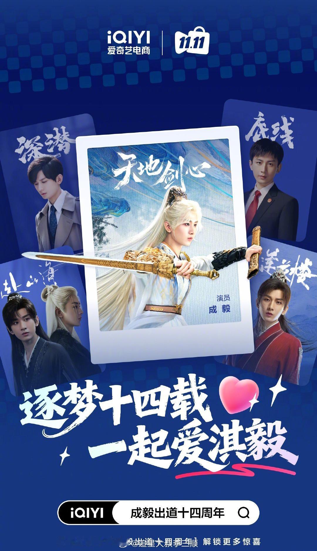 爱奇艺发文祝成毅出道14周年快乐,期待《天地剑心》大男主王权富贵~​​​