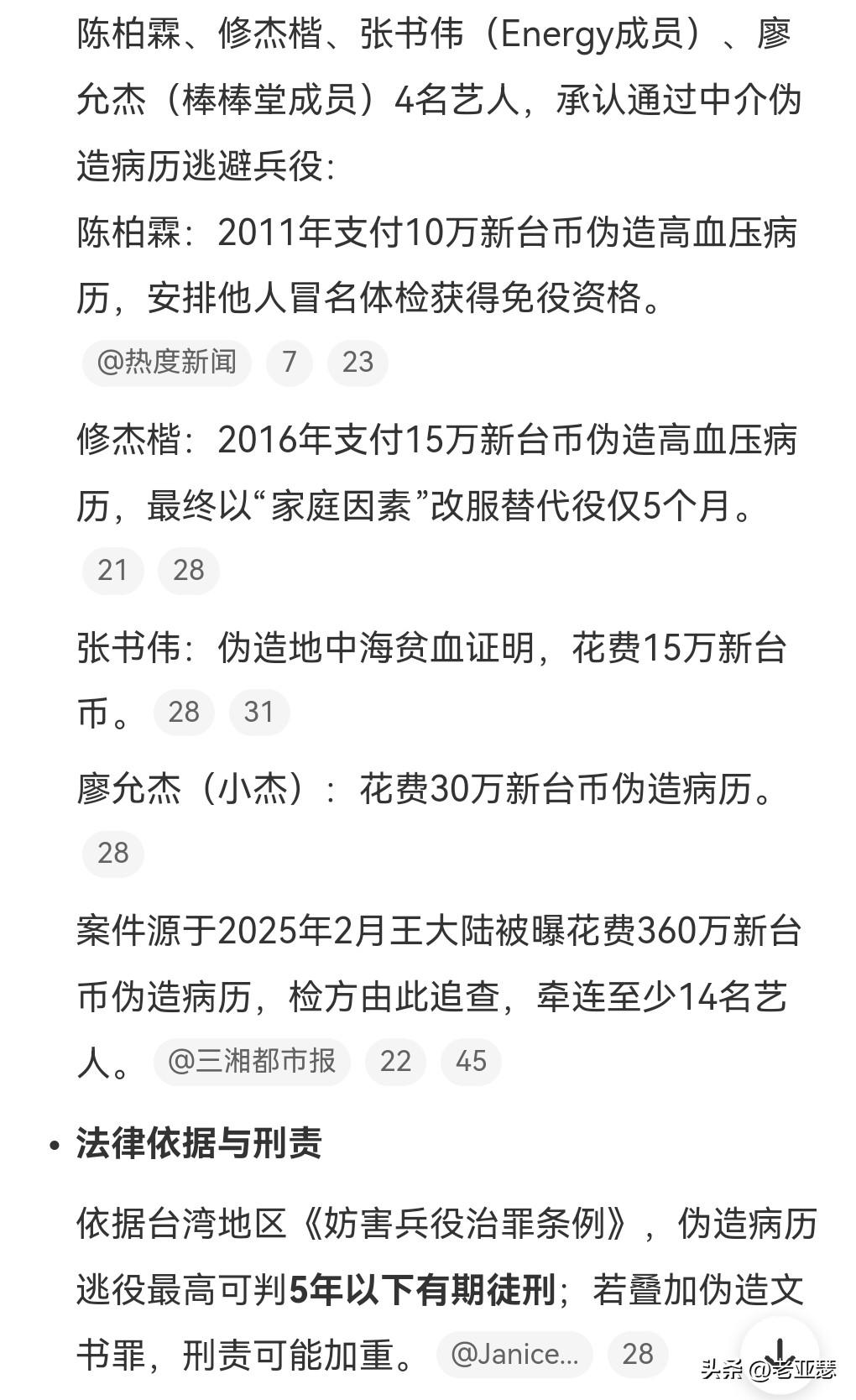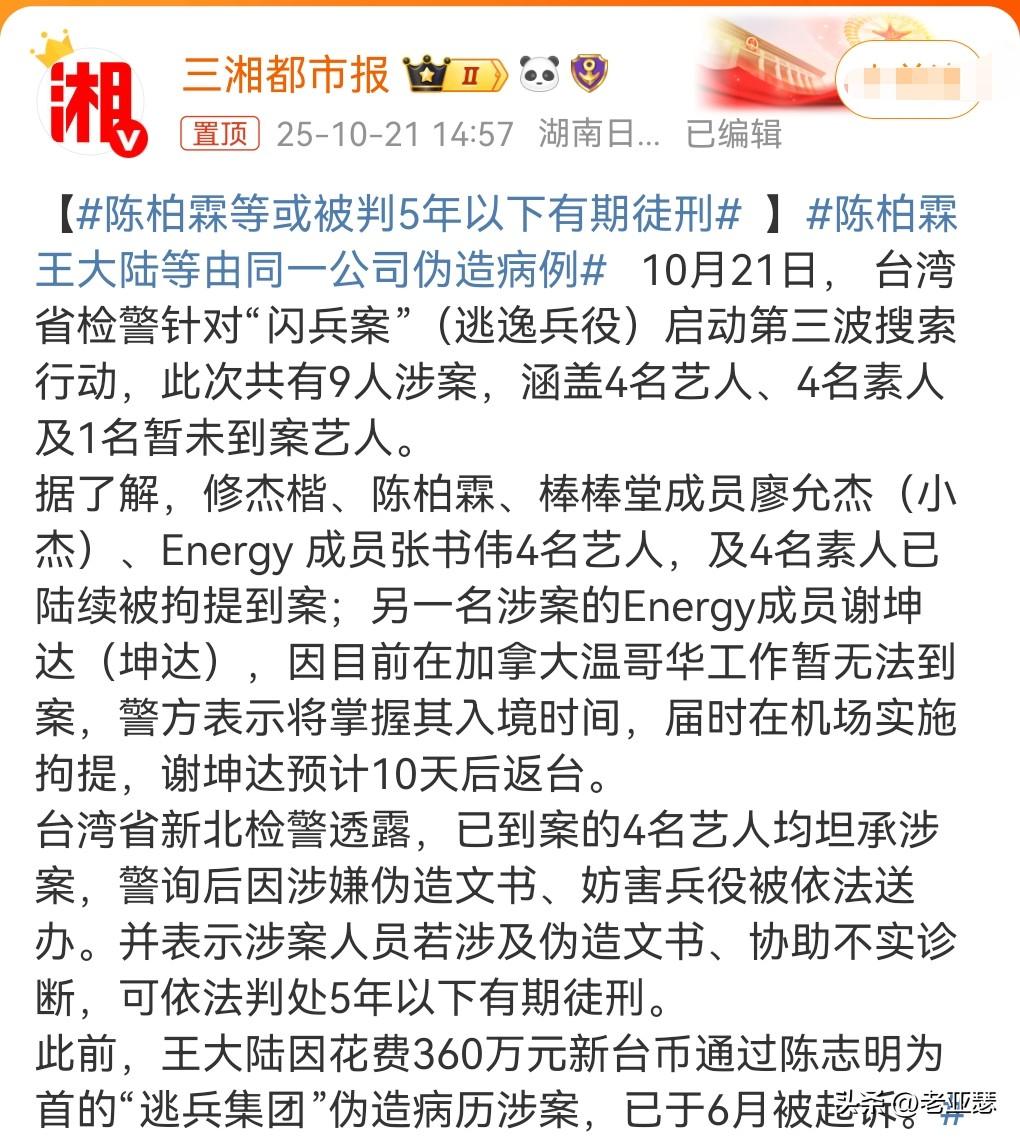 逃兵役那是很可怕的。 在台湾和韩国明星都要义务服兵役的。 如果耍手段拒绝服兵役,那肯定是违反了相关的法律。 10月21日在网上看到这么个事情,贾静雯的老公修杰楷,以及陈柏霖等艺人,由于拒服兵役,通过病病历造假逃兵役,这非常的可恶,有可能要被判5年以下有期徒刑。 这真是敲响了警钟啊。 毕竟在法律面前人人平等,艺人也不能有特权。