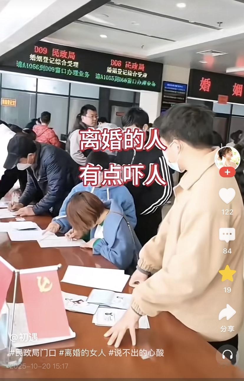 一网友在婚姻登记大厅拍下惊人一幕,离婚的人排着长队,签字时没吵没闹,个个面无表情! 唉!现在的年轻人生活压力大能理解,可是当初结婚时哪一对不是铺排的满满当当,最后连几年都支撑不下来,实属不理解,与其这么折腾一番,当初单着各自安好!