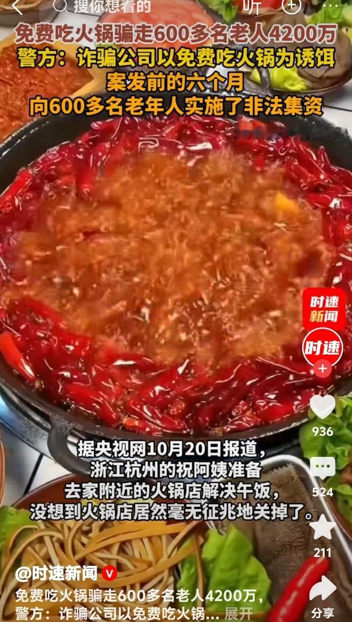 杭州免费火锅惊天骗局背后:600位老人4200万养老金如何被“温情陷阱”一夜掏空? (来源:央视网、红星新闻、九派快讯综合报道) 那个看似普通的中午,杭州的祝阿姨像往常一样走向小区旁的火锅店,却只看到紧锁的大门和一张冰冷的封条。她手里攥着的不是餐券,而是一张写满承诺的“投资协议”——这家曾免费招待她三个月的火锅店,连同她投入的毕生积蓄,一夜之间消失了。 这不是一场简单的关门跑路。警方调查揭开真相:诈骗团伙打着“养老互助”的旗号,用免费火锅作为诱饵,在六个月内席卷了600余名老人的4200万元。老人们以为遇见了雪中送炭的“好心人”,实则踏进了精心编织的陷阱。 为什么老年人频频成为诈骗目标?或许从火锅店热气腾腾的烟火气中可见端倪。孤独的晚年生活里,一顿免费火锅不仅是省下的菜钱,更是被倾听、被关怀的情感慰藉。骗子们深谙此道,他们从不急着谈钱,而是先陪老人聊家长里短,记住每个老人的生日,甚至帮忙修理家电。这种“温情攻势”比任何话术都致命。 更令人心惊的是骗局的“合法性”。诈骗公司注册正规合同,邀请“专家”开展投资讲座,甚至组织老人参观所谓的“火锅连锁总部”。一位受害老人哽咽道:“他们说是扶持养老产业,年化收益8%,比银行高,还承诺随时退本……我攒了一辈子的钱,只想给孙子留点学费。” 这场骗局折射出更深层的社会隐痛。当子女忙于生计、社区养老资源匮乏时,老人们的情感需求和经济安全感成了最脆弱的软肋。骗子们钻的不是法律的空子,而是时代夹缝中的人性缝隙。 但阳光终将照进阴影。杭州警方通过资金流向追踪,已冻结部分涉案资产,并呼吁更多受害者报案。法律专家指出,此类“养老投资”骗局往往利用老人信息闭塞的弱点,亲属应主动帮助核实项目资质,警惕高回报承诺。 这4200万元背后,是600个家庭的风暴。有老人因自责一病不起,也有子女反思:“如果平时多打一个电话,多回一次家,父母是否就不会被那句‘阿姨,您就像我亲妈’打动?” 骗局会落幕,但留给社会的思考不应停止。当我们谈论养老时,不能只关注物质保障,更要看见那些被时代匆匆甩下的灵魂。他们需要的或许不是更高的利息,而是一双紧握的手,一个随时能拨通的电话号码。 杭州身边事 杭州生活