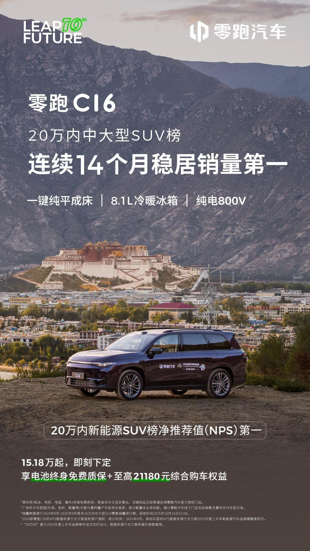 零跑汽车有多强?周销订单1万+交付量1.3万,销量连续稳在高位。 当下的新能源汽车市场虽然竞争越发激烈,但零跑汽车的交付量却连续稳在高位:零跑最新一周新增订单超1万,实际交付量1.3万台,大概率优势周销第一,表现可以说相当扎实;同时订单与交付比例健康,也说明经销商库存不足1个月,公司经营状态健康。 如今,零跑旗下在售的产品主要覆盖10-20万级的市场,而且每一款产品都是所在领域的佼佼者。比如在20万内大六座新能源SUV市场,C16的表现就相当亮眼,不仅是20万内新能源SUV榜净推荐值(NPS)前两名,还14个月蝉联20万内中大型SUV销量榜第一名。 有一说一,2026款C16的产品力的确能打,纯电版续航里程增加至630km,还有五座版和六座版可选,其中五座版配备电动一键大床模式、豪华后排座椅+中央大扶手等十项同级唯一标配,做到了“入门即满配”。另外,接近年底,零跑也针对C16给出了至高24680元购车礼遇+四项终身免费质保的促销政策,可以说相当划算,而且据悉明年国家购置税减免将开始退坡,C16到时候要交好几千的购置税。如此一来,现在买C16,相当于能省下好几个月的工资,相当划算。 不得不说,零跑已经能够把订单转化为口碑,把声量沉淀为信任,并且零跑冲击高端的旗舰D平台已经发布,零跑品牌形象更进一步,这个月销量估计又能领跑新势力阵营了。