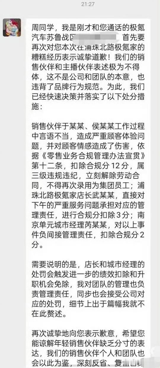 这是卖车吗?这是给顾客添堵吧,顾客说要买小米YU7,极氪销售恶意拉踩诅咒,这也太没素质了吧,你想卖车拿提成这很正常,但是拉踩真的没必要。 幸好极氪这一次反应够快,立马给当事人道歉并开除了销售,要不然这事肯定没完,官网都得被网友冲了[笑哭][笑哭]