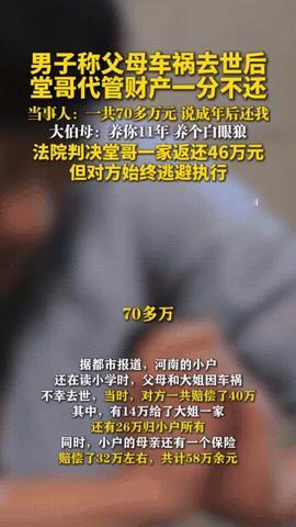 “代管遗产变占有?”河南,一小伙父母车祸去世,留下70多万赔偿款,堂哥主动接手代管,承诺说“我替你管着,成年 就还”,结果11年后一分不给还骂白眼狼?小伙:“养我有恩我忍,但不能一分不给吧!” 小户表示,当时堂哥私下给他说跟着他们住,赔偿的钱由他们代为保管等成年就归还。 可等他大学毕业要这笔钱时,堂哥却说花光了,连10多万孤儿补贴和租金也被占了。 更讽刺的是,小户翻出流水,三年大学堂哥才给了1.4万。 法院判堂哥还46万,可人家直接失联跑路,名下财产也早转没了,更气人的是,堂哥还拿这笔钱给自家儿子娶媳妇买车。 大伯母还喊着:“养你11年对你这么好,养个白眼狼”。 法律明明规定,监护人不能随便动被监护人的钱,这根本就是借着亲情“吃绝户”。 养恩和贪财从来不是一回事,占孤儿的钱良心不会痛吗?