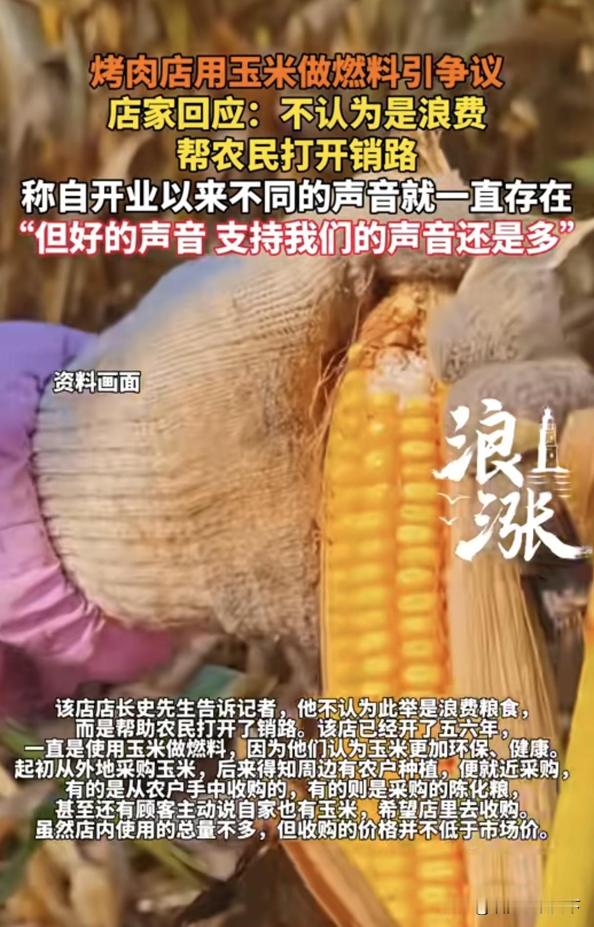 有错吗?烤肉店用玉米🌽当燃料被吐槽浪费粮食,烤肉点回应:不会浪费,而且还能帮助农民打开销路! 近期,山东烟台一家烤肉饭使用玉米🌽当燃料事件颇受争议,有人认为这就是在浪费粮食,这种行为就应该谴责。 据悉,该烤肉店已经开业有五六年,一直都是使用玉米🌽做燃料,一是玉米做燃料更加健康环保,二是还能还农民增加收入,他们觉得这样做很好没有错,但是自从开业以来也一直收到很多人的质疑。 有网友表示:你们猜猜木炭多少钱一斤? 7块!玉米才 9毛一斤!买一斤木炭就可以买7斤玉米,如果我是老板,我也会选择玉米! 也有网友表示:只要是好的结果,那就是好的,人的思维要转变,玉米做燃料烧烤是不是吃了会更安全,农民也有收益,这样大家都受益了不是挺好的吗?没必要把自己的观点和思维方式强压在每个人的身上,然后农民的玉米卖不掉,又不帮忙打开销路。 还有网友表示:现在的农业不是以前的小农了,不怕你浪费,就怕滞销,最后全部烂掉。但是浪费是恶习,和传统美德背离,所以有人不能接受也是正常。 更有网友表示:买的老板愿意,卖的农民愿意,网友不愿意了,咋滴农民积压仓库的玉米你们去收了呗! 不知道大家对此事怎么看?欢迎留言一起探讨交流。 烤肉店用玉米燃料