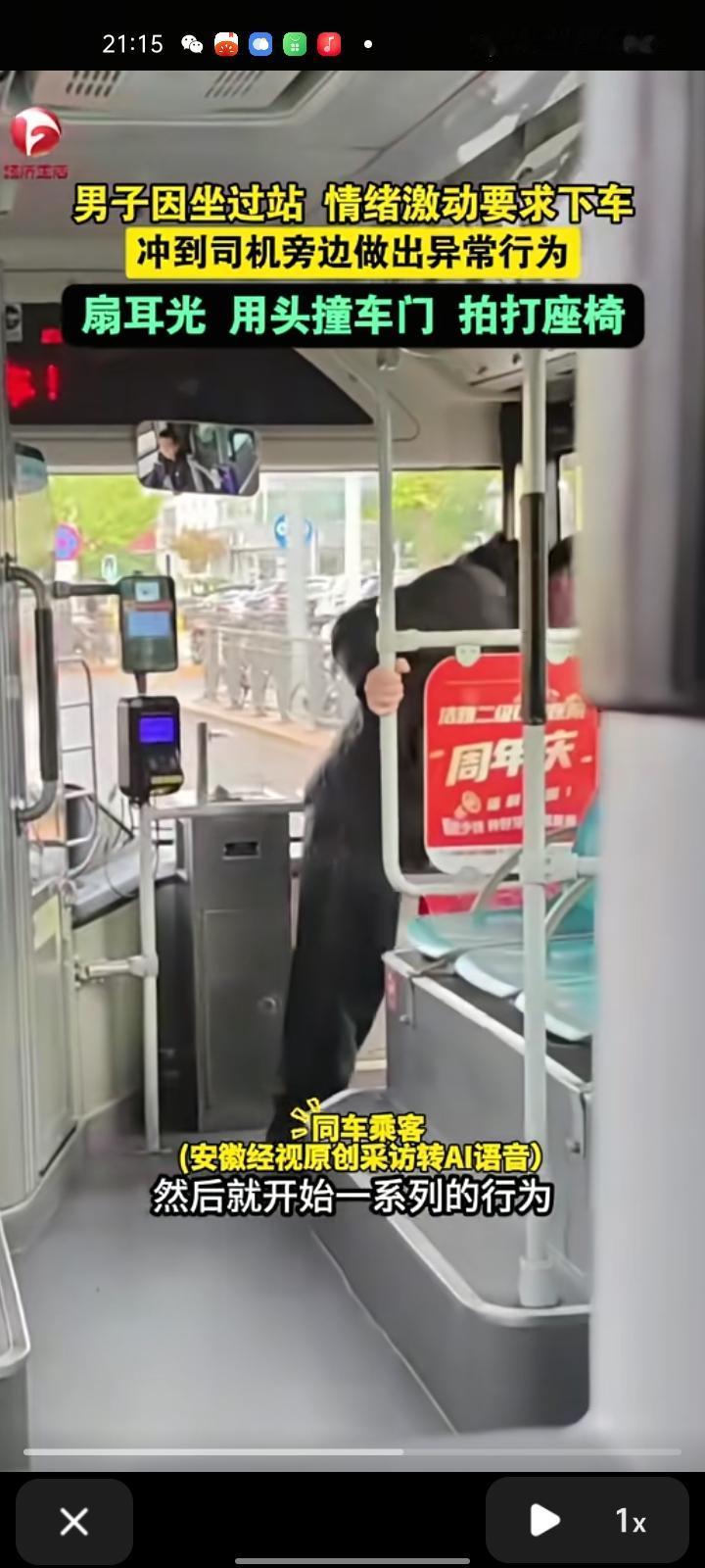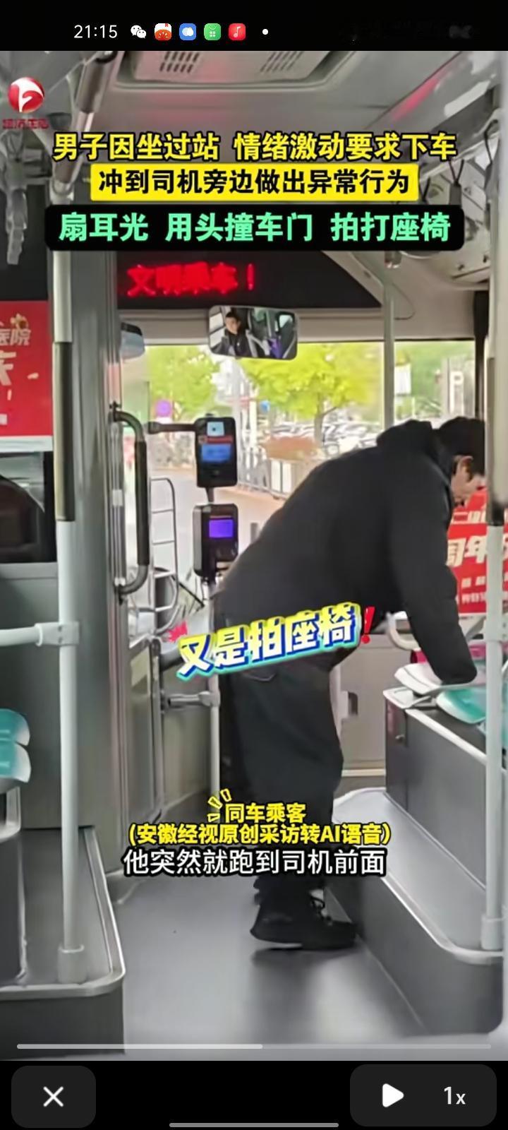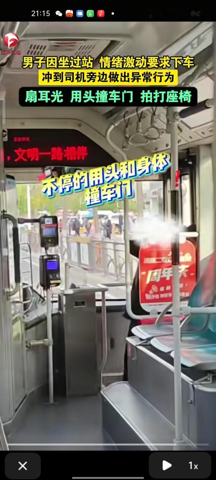 10月20日,辽宁大连。网友晒视频称,一男子因坐过站,吵着要求司机下车,司机说到站后往回坐就行。男子情绪升温,做出异常行为,对自己扇耳光、用头撞车门、拍打座椅,司机依旧无动于衷,下车后对着路边栏杆一顿踢打,仿佛没泄完的气球。