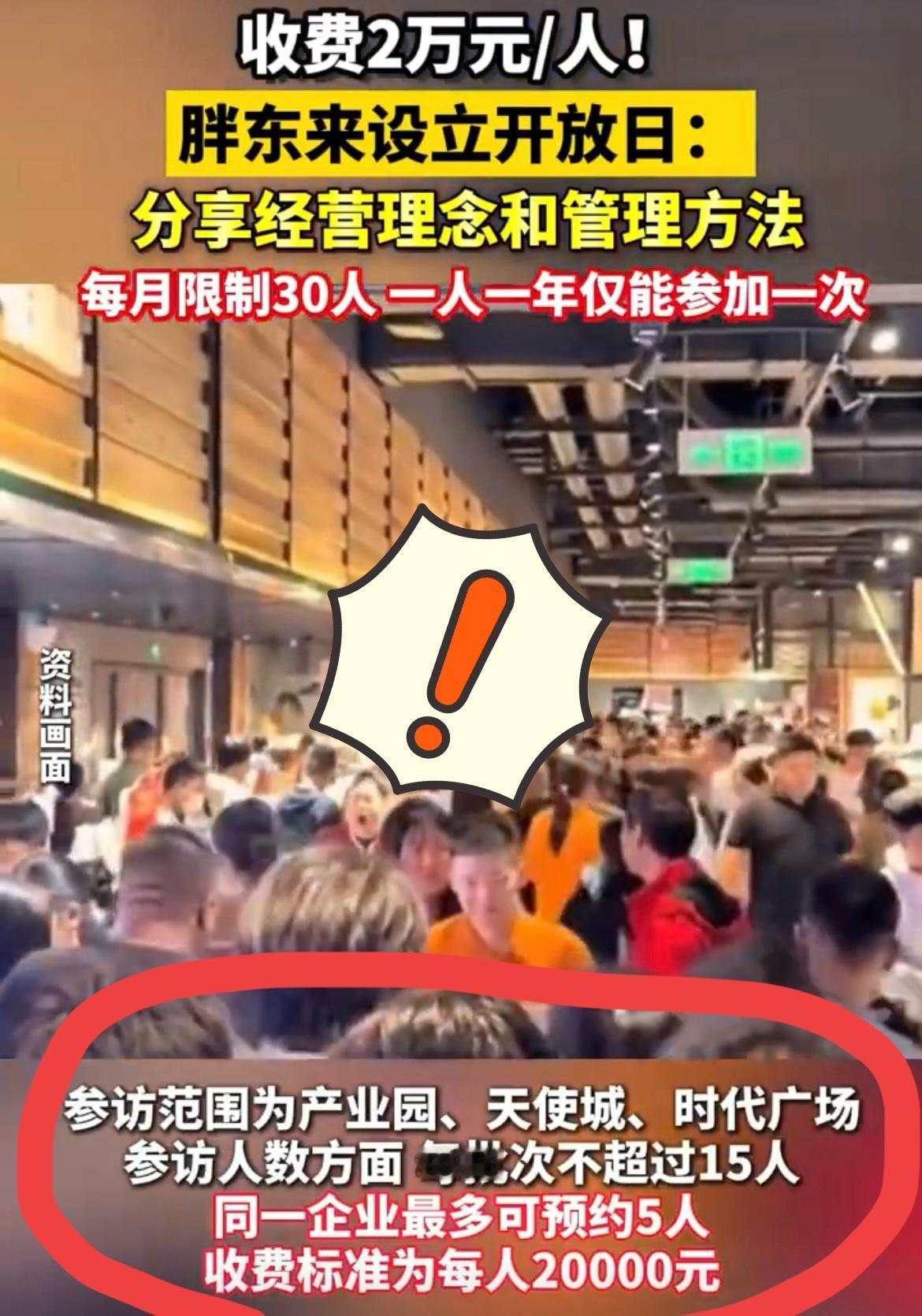 我有种预感 胖东来,怕是又要上热搜了 参访收费每人2万? 并且一个月只开放30个名额, 这怕不是要比抢演唱会票还难? 网友都在议论,虽然胖东来确实做的好,服务行业的标杆企业。 但是收费2万,还要预约?这是不是太过于太自信了些? 不过要我说,对于想学习胖东来经营理念的企业家来说,2万也不贵,毕竟现在就是一个知识付费的年代。 要是真能学到东西,回来学以致用,促进企业发展,那这2万也值了!