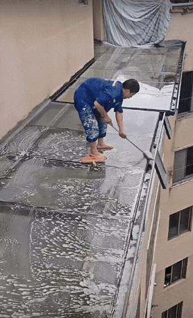胆子太大了!工人不穿戴防护装备,光着脚在楼顶清洗玻璃,几十层楼的高度看着腿都软了。这要是工人脚一滑掉下去了,责任算谁的?好歹在腰上绑根绳子也行啊。