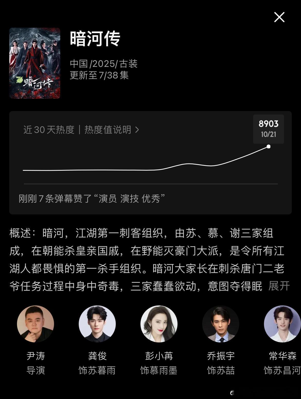 龚俊暗河传 首日热度7875,预计播放量1300万上下;暗河传优酷热度破8000