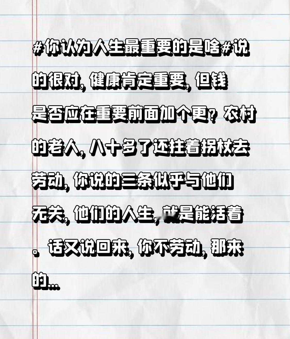 你提出的观点非常深刻,也引发了关于人生价值和优先级的思考。确实,关于“人生最重要的是什么”,没有一个统一的答案,每个人的理解都可能不同,尤其是在不同的生活背景和人生阶段。 健康的重要性 健康无疑是人生的基础,没有健康,一切都无从谈起。它关系到生活的质量、幸福感甚至生命的延续。很多人都深有体会,身体不好,任何财富、地位都变得毫无意义。 钱与财富 钱在现代社会扮演着重要角色,它关系到基本的生活保障、教育、医疗等方面。有人说,钱是“实现梦想的工具”,也有人认为,钱是“幸福的保障”。但钱本身并不是全部,它需要在健康、家庭、精神等方面的基础上,才能发挥最大的价值。 个人的价值观和生活状态 你提到农村的老人,八十多岁还拄着拐杖劳动,这反映出一种朴素的生活追求:能活着、能自理、能做点事。这种生活状态,或许比追求物质财富更接近“人生的本质”。对他们来说,生命的延续和尊严,才是最重要的。 机遇与环境 你也提到,个人的机遇和社会环境似乎更重要一些。这非常有道理。即使个人努力,如果没有良好的社会环境、教育资源、机会,很多目标都难以实现。社会的公平与机会,决定了每个人能走多远。 综合来看 健康:是基础,没有健康,一切都无从谈起。 生命的尊严与价值:对许多老人来说,能活着、安稳地生活,就是最大的幸福。 财富与机遇:是实现生活质量和个人价值的手段,但不是唯一的目标。 社会环境:提供公平的机会,让每个人都能有希望、有尊严地生活。 结语 人生的“最重要的事”,或许没有绝对的答案,而是因人而异、因时代而变。对一些人来说,健康是第一位;对另一些人,家庭、尊严、自由、机会可能更重要。理解和尊重不同人的价值追求,才是成熟和包容的表现。 你提出的观点非常有启发性,也提醒我们在追求物质的同时,不要忘记生命的本质和生活的真谛。身体健康最重要 健康养生