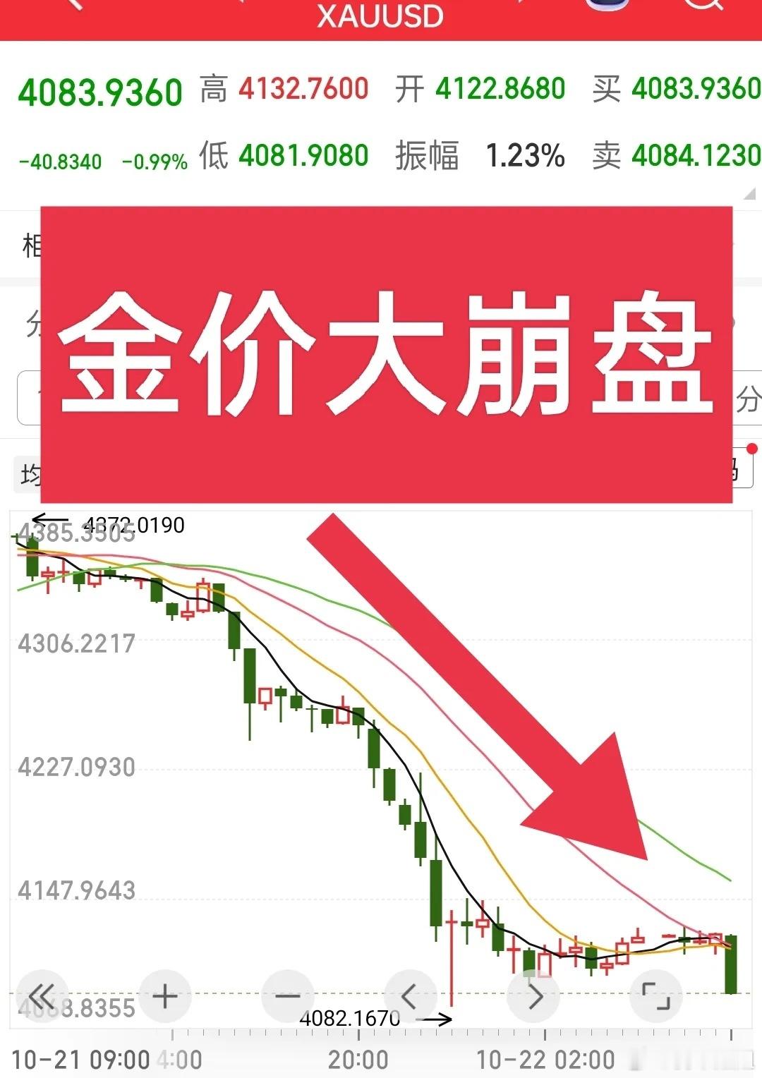 太恐怖了!国际金价大崩盘,就在昨天,国际金价出现让人惊慌失措的节奏,盘中回调超250美元每盎司。从高点4379美元每盎司一路回落到4080美元每盎司附近,从整个过程的回落情况来看,有出现之前文章提到的破位迹象。也就是说,从短期来看,还是依然看震荡走低的节奏为主。有朋友说,是否在这个时候可以考虑逢低上车呢?如果作为谨慎的投资者,或许还是应该保持谨慎态度。之前的文章就有说到过,一旦下破了4100美元每盎司,那将会是“一泻千里”“大瀑布”行情,而昨晚的行情刚好就验证这个观点。也就是说目前还是适合多观察。如果是中长期的投资者或许也应该考虑何去何从了。如果接下来4000美元每盎司没有出现承接止住,或许大周期就会发生很大变化。以上只是个人观点,不作参考如果觉得有道理,可以点赞,点关注,谢谢!黄金未来会一直上涨吗黄金下跌多少,你会开始入手