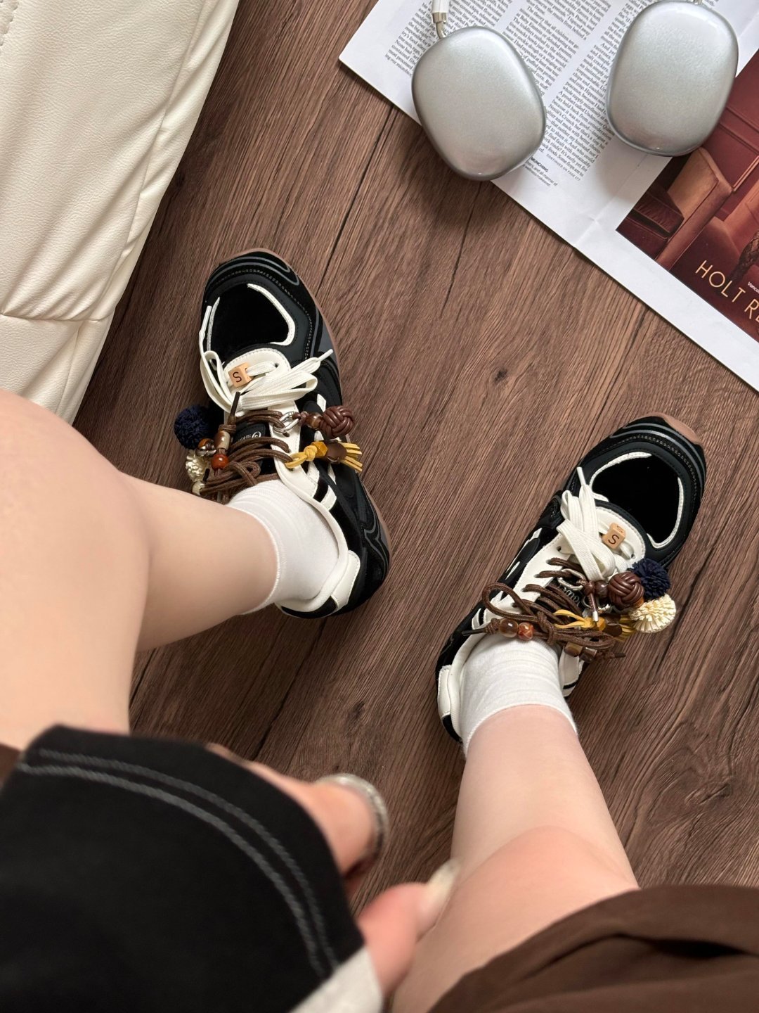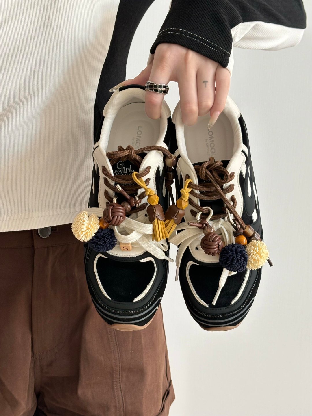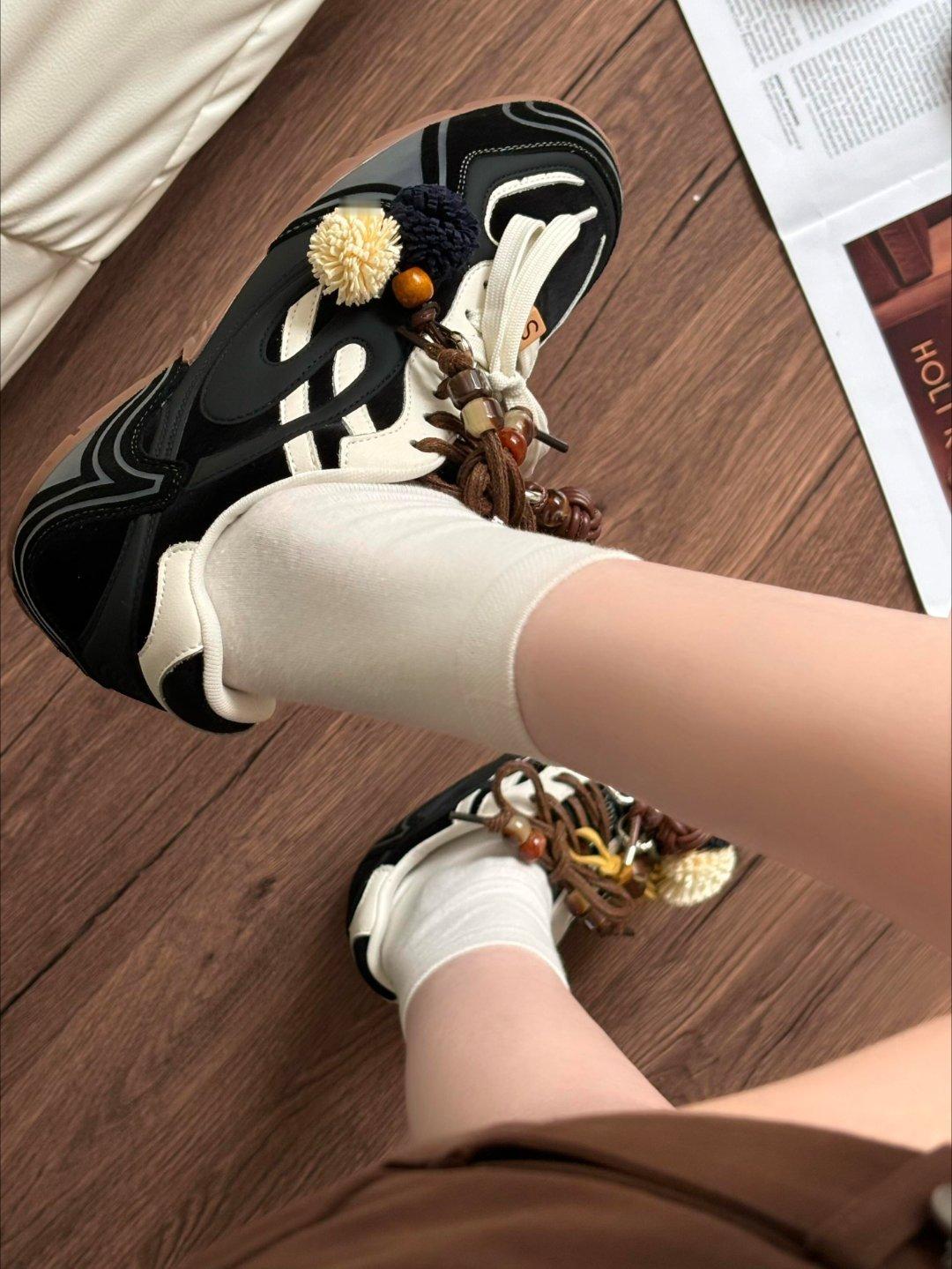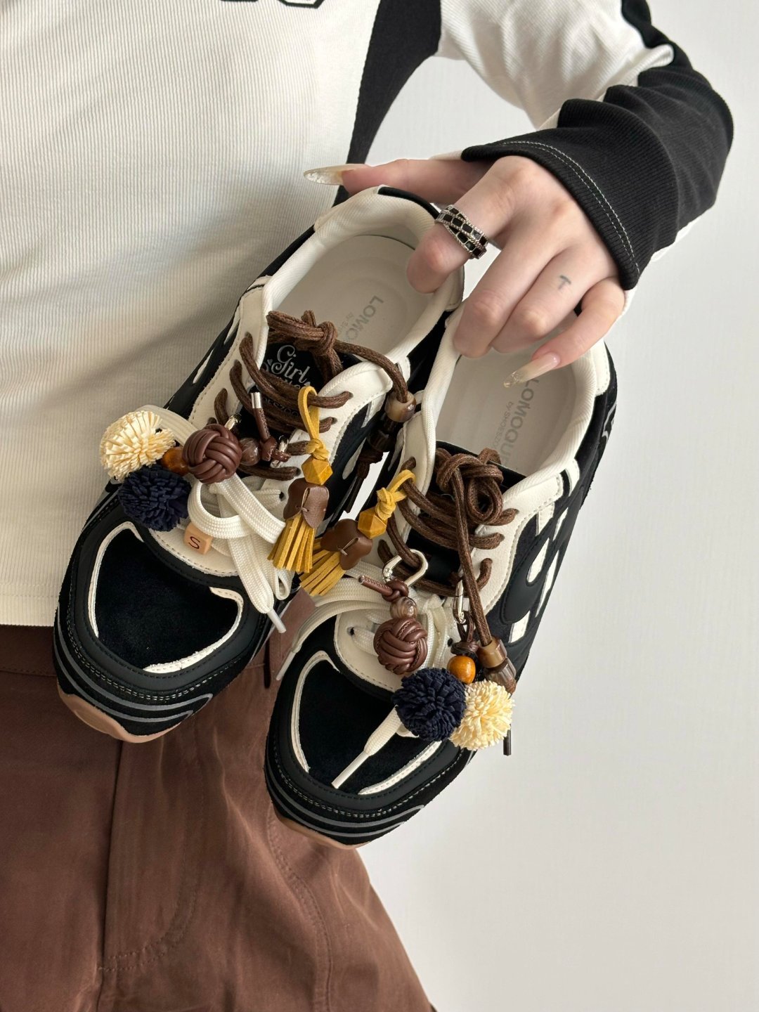 这双黑白撞色运动鞋把“复古甜酷”焊在了鞋面上,经典黑白纹路自带复古质感,鞋带处的棕调绳结、毛球、串珠装饰,像把秋日氛围感直接挂在了鞋上,细节里全是巧思。
