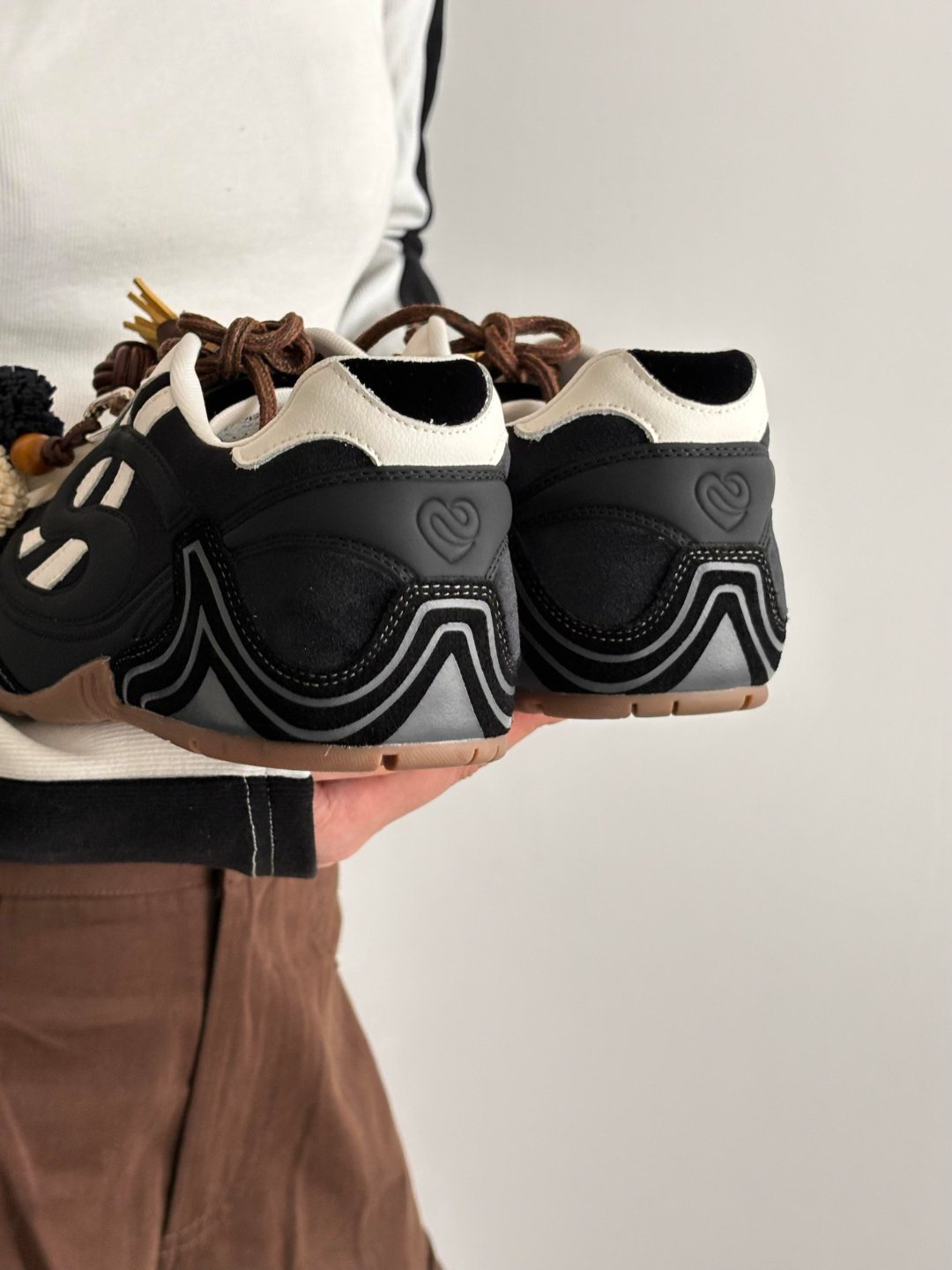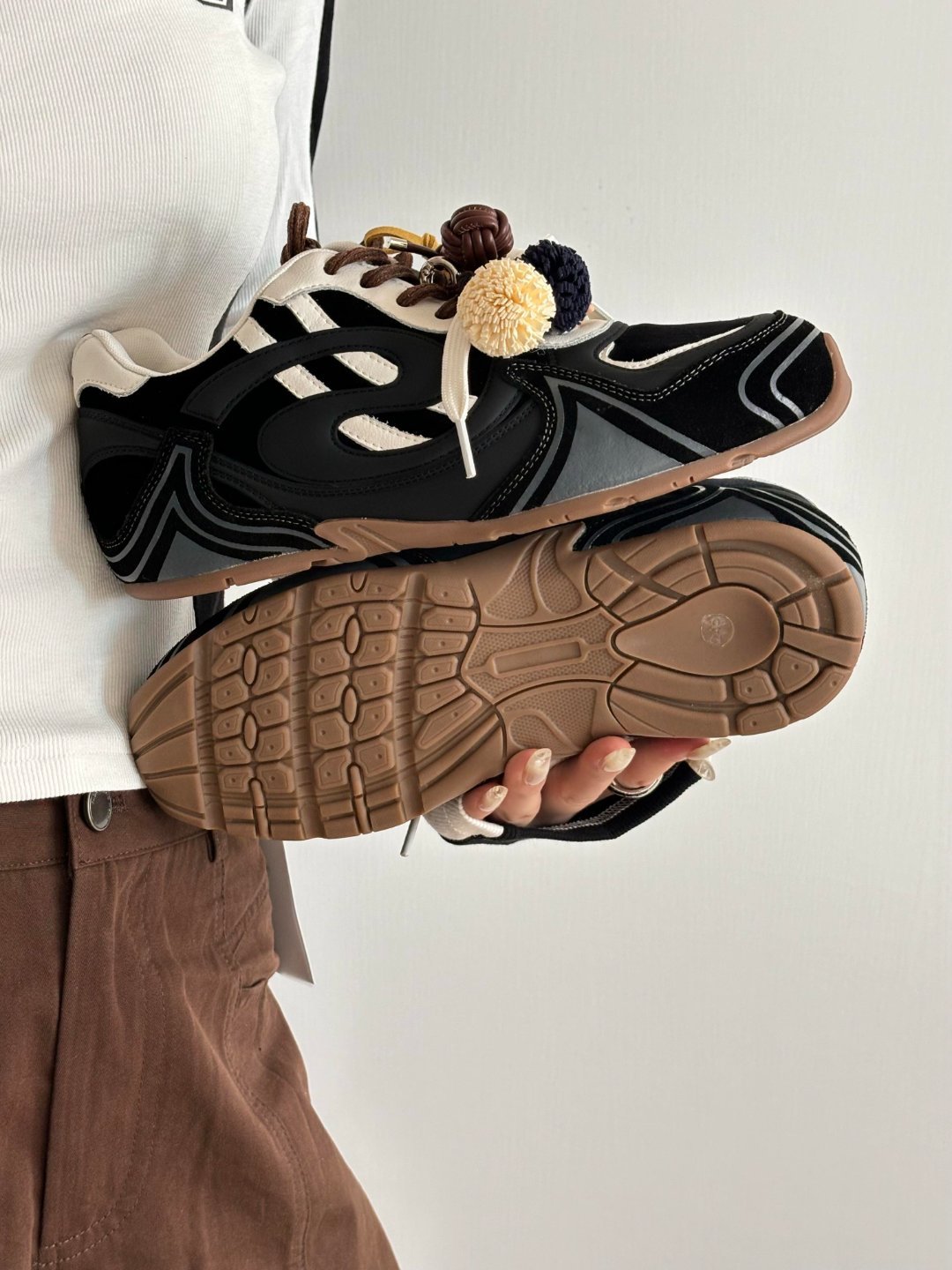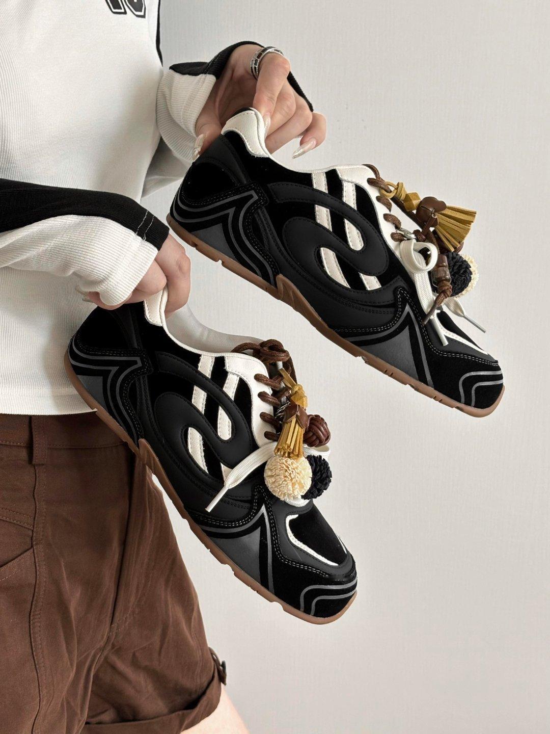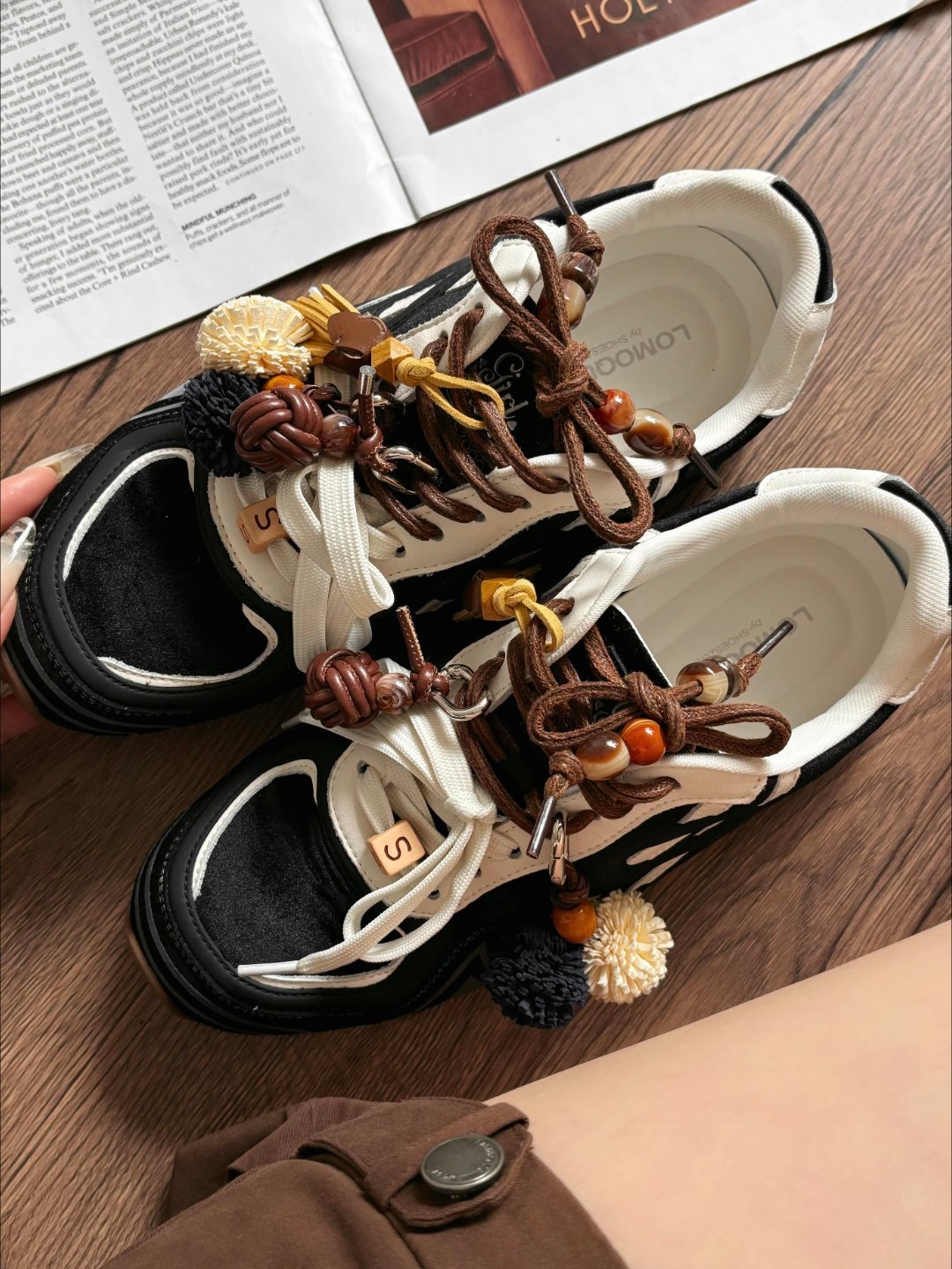 这双黑白撞色运动鞋把“复古甜酷”焊在了鞋面上,经典黑白纹路自带复古质感,鞋带处的棕调绳结、毛球、串珠装饰,像把秋日氛围感直接挂在了鞋上,细节里全是巧思。