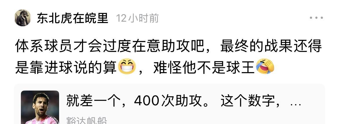 “进球多只是射手,激活队友才是全队灵魂”,梅西身体力行的这句话,某些人主观上是无论如何都听不进去的,也是客观上无论如何都做不到的。这就罢了,他的粉丝还要倒反天罡,说出“体系球员才会过度在意助攻”这样的话。没有队友们勤勉的助攻,他们的主子哪来那么多进球?