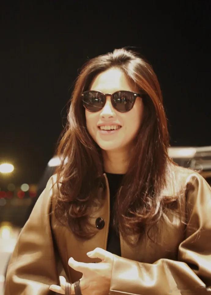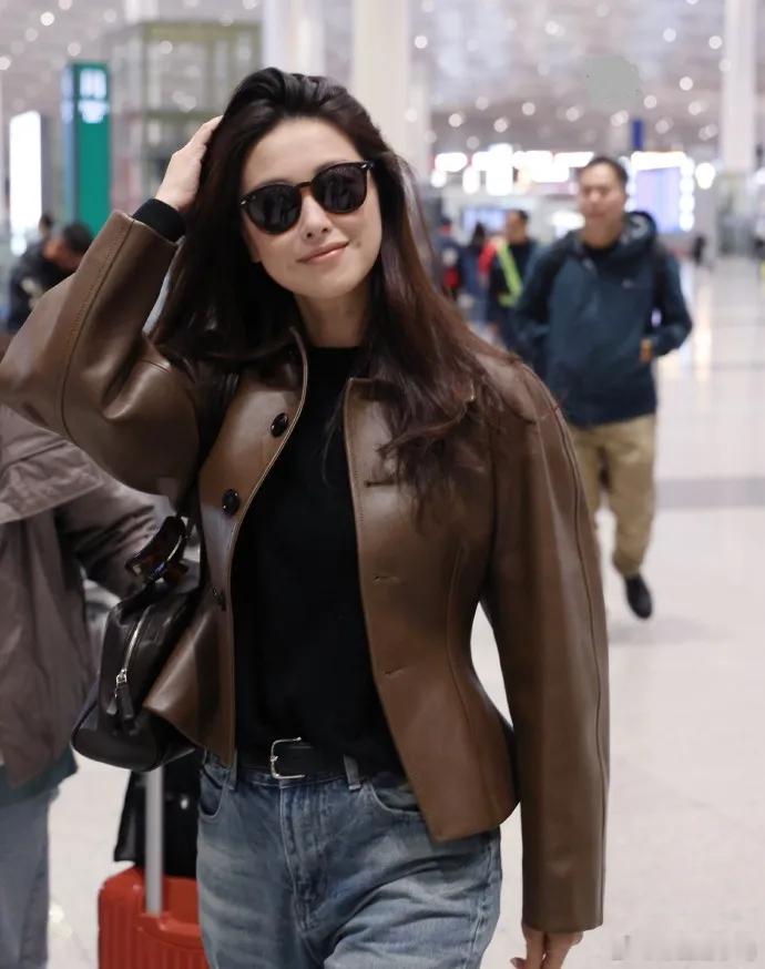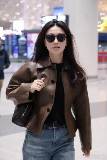 她内搭一件黑色打底衫,外搭咖色修身皮质夹克,叠穿设计层次感十足,尽显时尚品味。下装选择了一条复古风牛仔裤,巧妙勾勒出优越的身材比例,每一处细节都透着精致与格调。