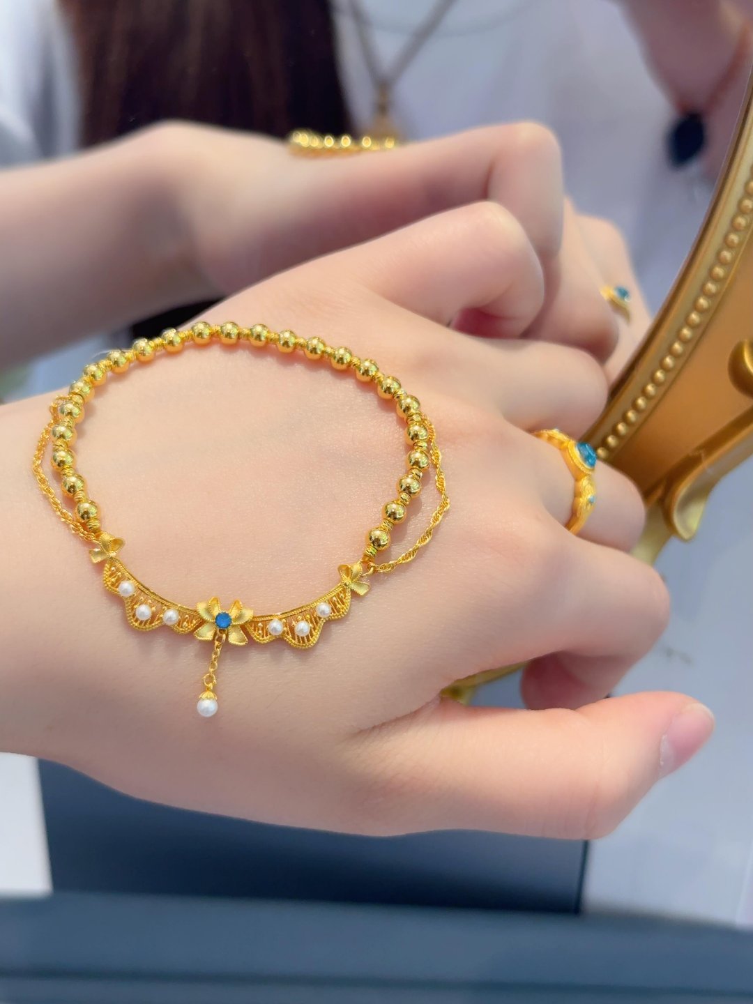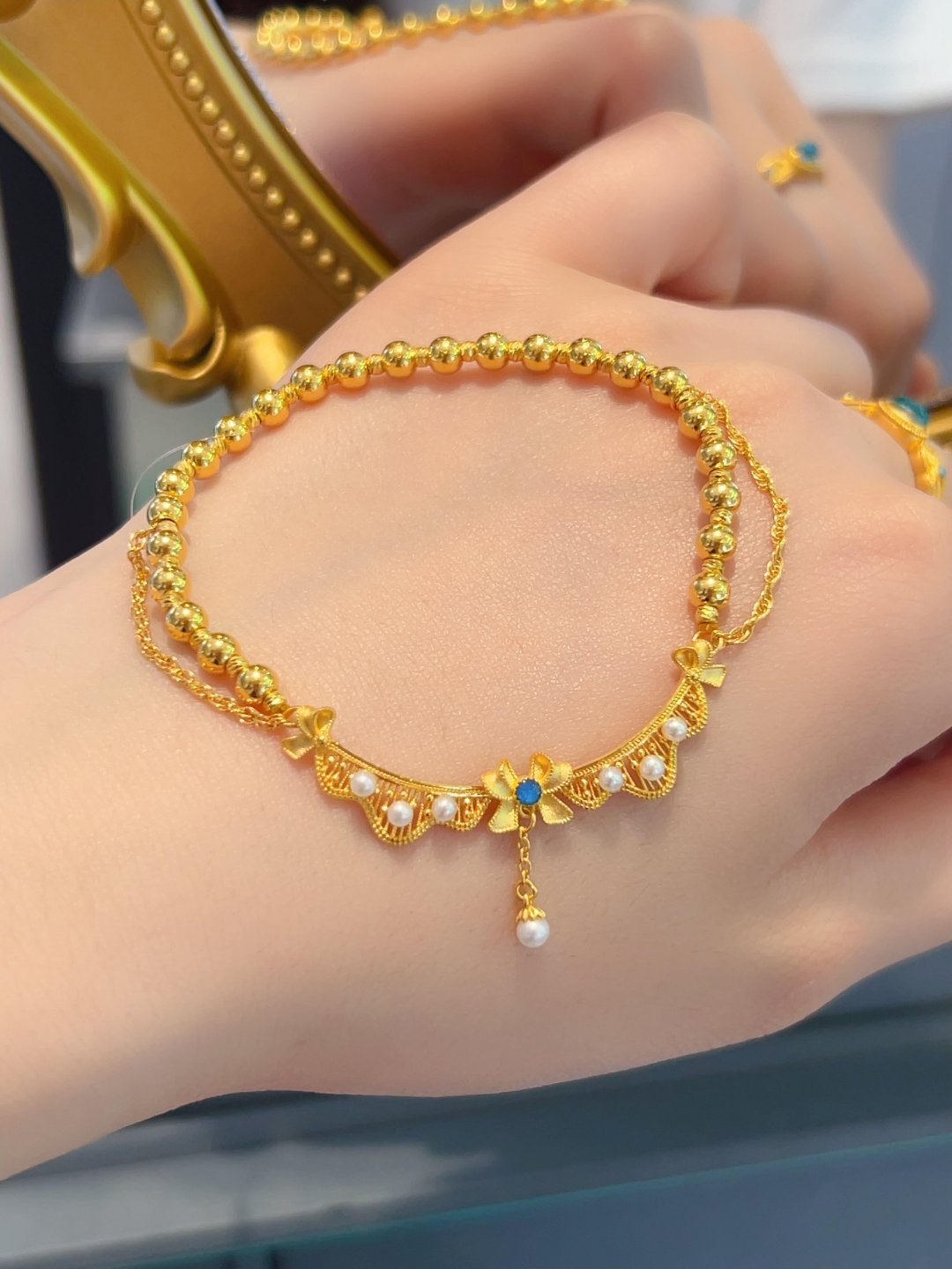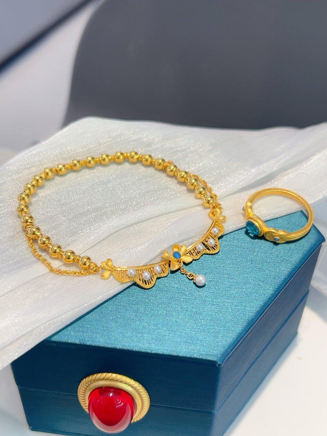 这条洛可可蕾丝裙足金手链,堪称“金饰里的国风诗画”。细润金丝织就蕾丝肌理,雕花如宫廷绣纹般精巧,珍珠与蓝饰点缀其间,像把盛唐华光凝在腕间。足金的醇厚光泽裹着柔媚线条,既藏着手工艺人的针尖匠心,又透着古画里的绮丽风骨。抬手时流苏轻晃,仿佛将千年的雅致与贵气,都揉进了这方寸之间的熠熠流光里。配饰种草时尚配饰这配饰有点人设在身上