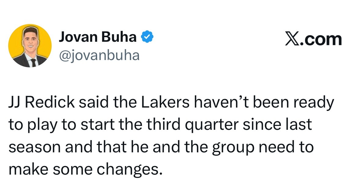 雷迪克表示,自上赛季以来,湖人队在第三节开局阶段始终未能做好比赛准备,他和团队需要做出一些调整。
