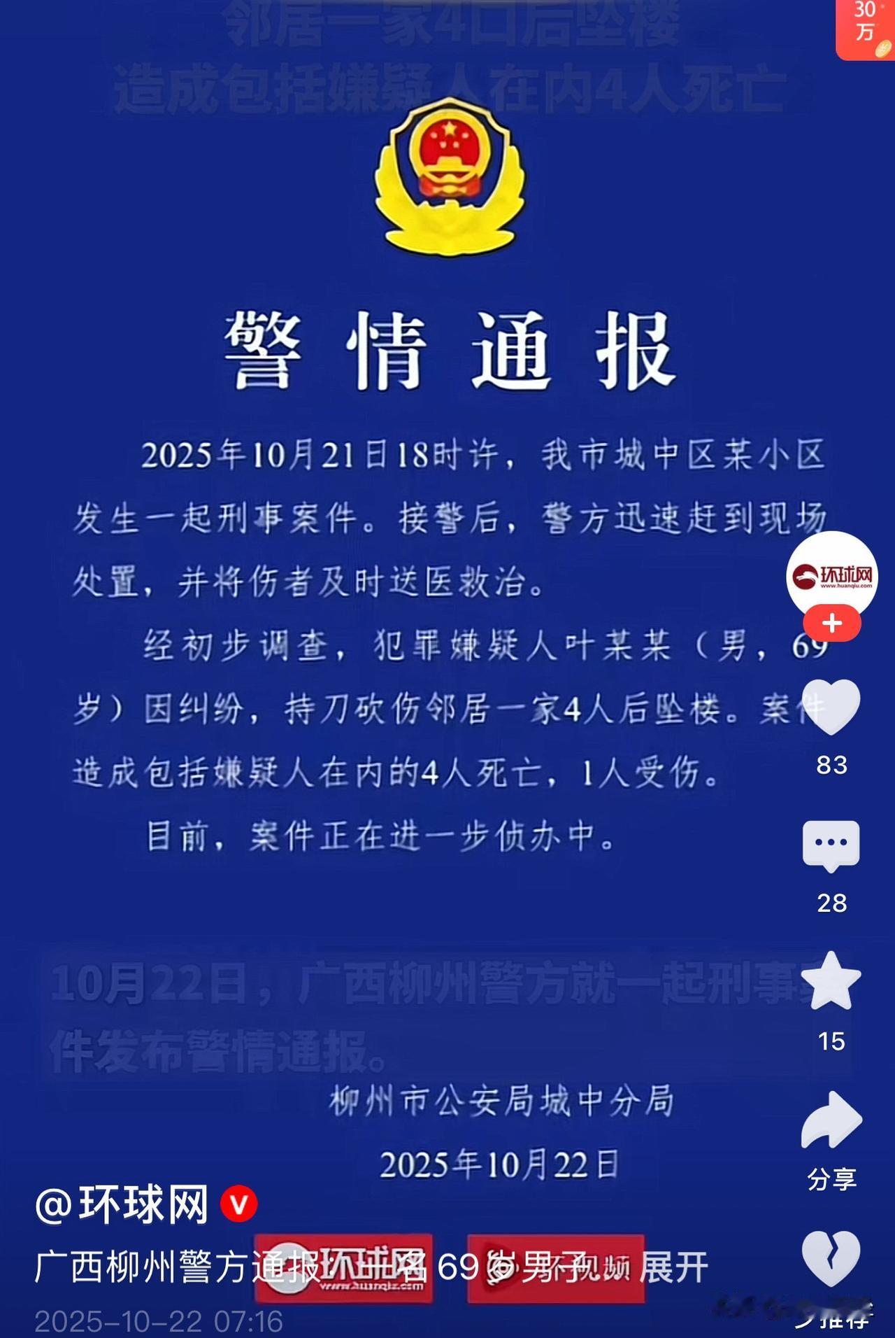 古稀之年去杀人,意欲何为? 广西柳州市一位69岁的男子杀害邻居后坠楼身亡,他的惨烈举动造成4死1伤的人间悲剧。 古话说,远亲不如近邻,说的就是要与身边的人搞好关系。 其实,熟人之间在生活中最容易发生矛盾。尤其邻居间或者同事间,因为生活和工作中接触比较频繁,有共同的利益圈,也因此容易引发摩擦。 广西柳州通报的作案当事人69岁的年纪,古稀之年早已过了爱冲动的年纪,不知道他为何钻了牛角尖,杀人泄愤,然后选择同归于尽。