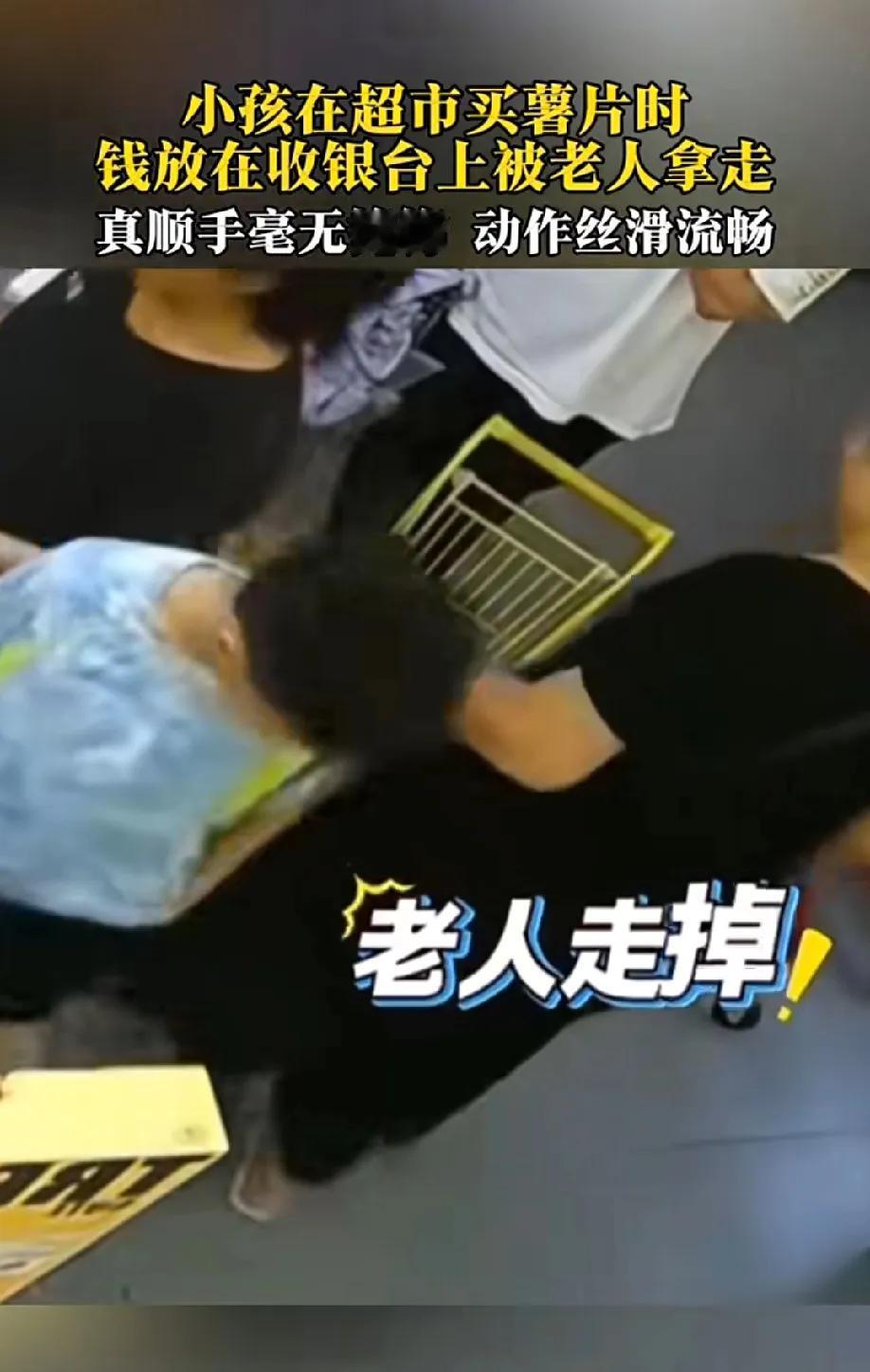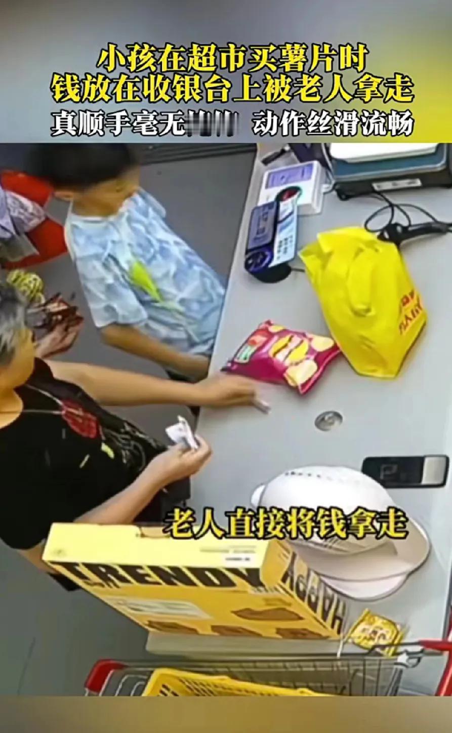 这钱都拿,过分了!真是为老不尊! 小孩表示买薯片时,钱放在桌子上被老人拿走,真是顺手牵羊,毫无掩饰,动作丝滑流畅,肯定是个惯犯! 轮到小孩结账的时候,钱没了,东翻翻西翻翻都找不到,很是慌张,吃不上东西是小事,但肯定很尴尬!反观老人收拾好钱,干净利索得走了。 这件事情启示,未成年人易成为盗窃目标,需加强监护和公共安全教育。家长应教导孩子保管财物,切记钱不可随意乱放,别给一些坏人有机可乘。而超市等场所应提升监控和巡查,以预防类似事件。