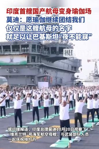 航母上做瑜伽,不用想猜都知道是谁了 印度人的思维果然是全球与众不同 日前印度总理莫迪视察首艘国产航母 没想到欢迎庆祝仪式上 表演起瑜伽了 莫迪还发表讲话说希望瑜伽让我们继续团结起来 巴基斯坦人听到航母的名字晚上都睡不好觉 这种思维估计只有他们才有了 莫名来的优越感