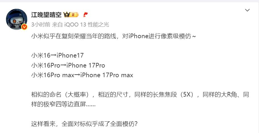 米粉们有福了,小米开始叫板iphone了,新产品16系列开始硬刚了 这怕不是连夜改了名吧,16都不叫了,直接改叫17 雷总这魄力,不得不说真的太雷霆万钧了 难道是看了苹果17系列的配置后,感觉还不如自家的产品 一股看不上的念头,莫名涌现 干脆把公司名字也改了吧,不叫小米了,叫米果,段位瞬间也高起来了 再过几年,把iphone直接收购了成旗下的子公司[捂脸] 到底是像素对标,还是像素级的模仿 雷总这是铁了心,要做平替机了啊,哈哈哈 那就看看市场的反应吧 真想看看,到底是果粉多还是米粉多