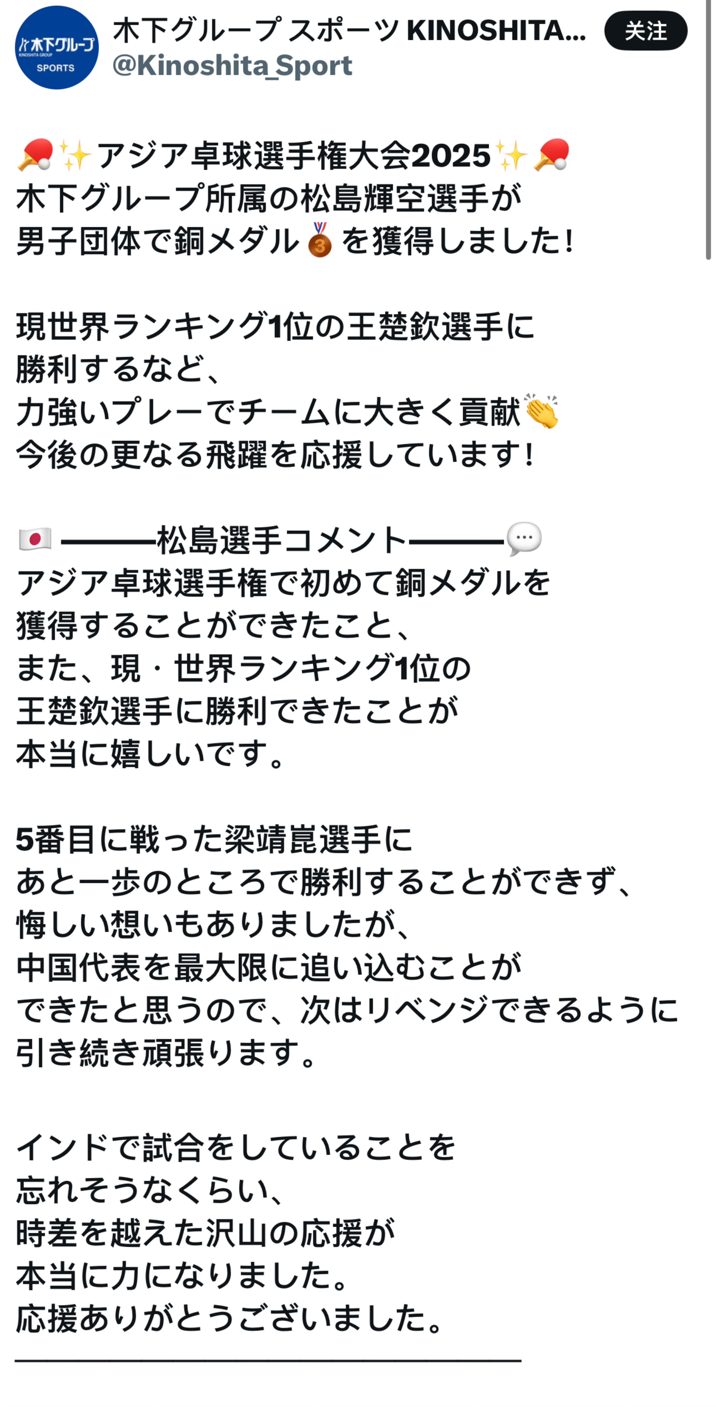 隶属于木下集团的松岛辉空选手在男子团体赛中获得了铜牌🥉!