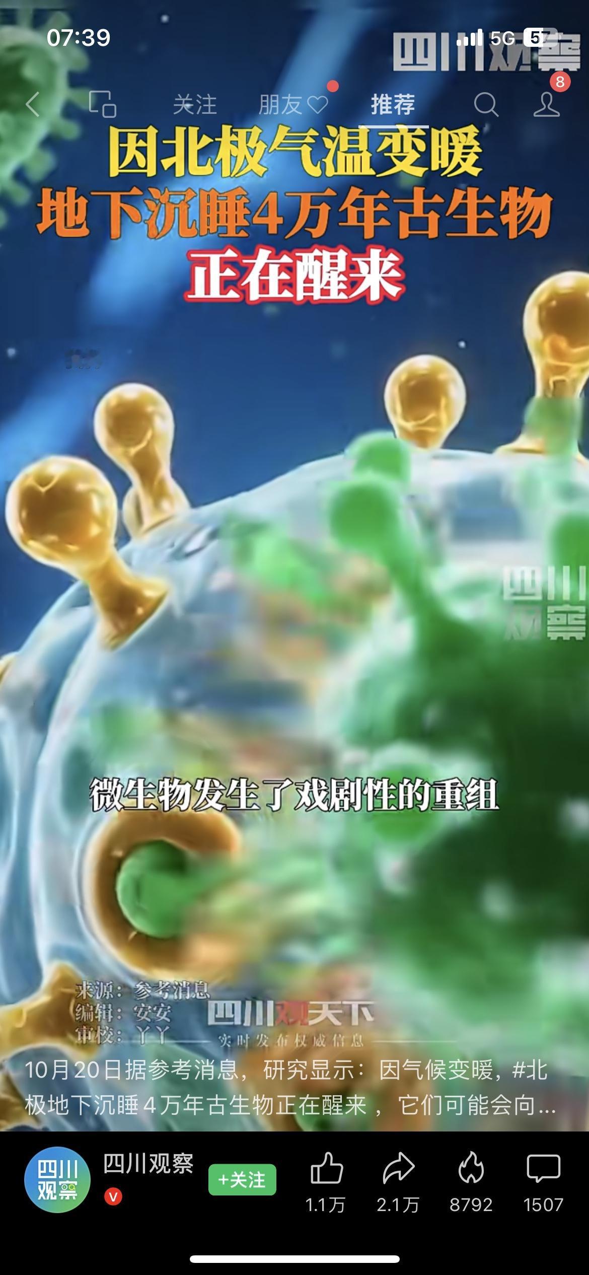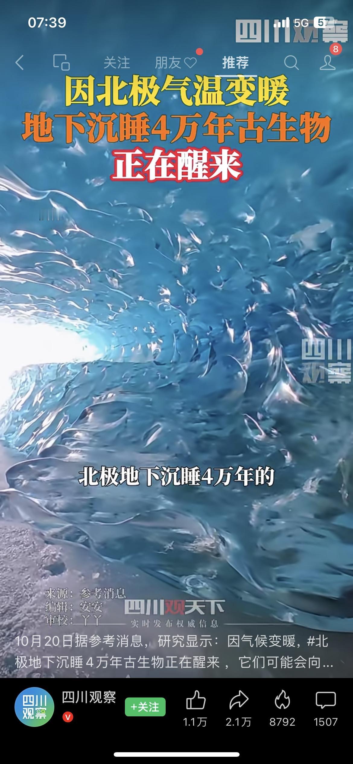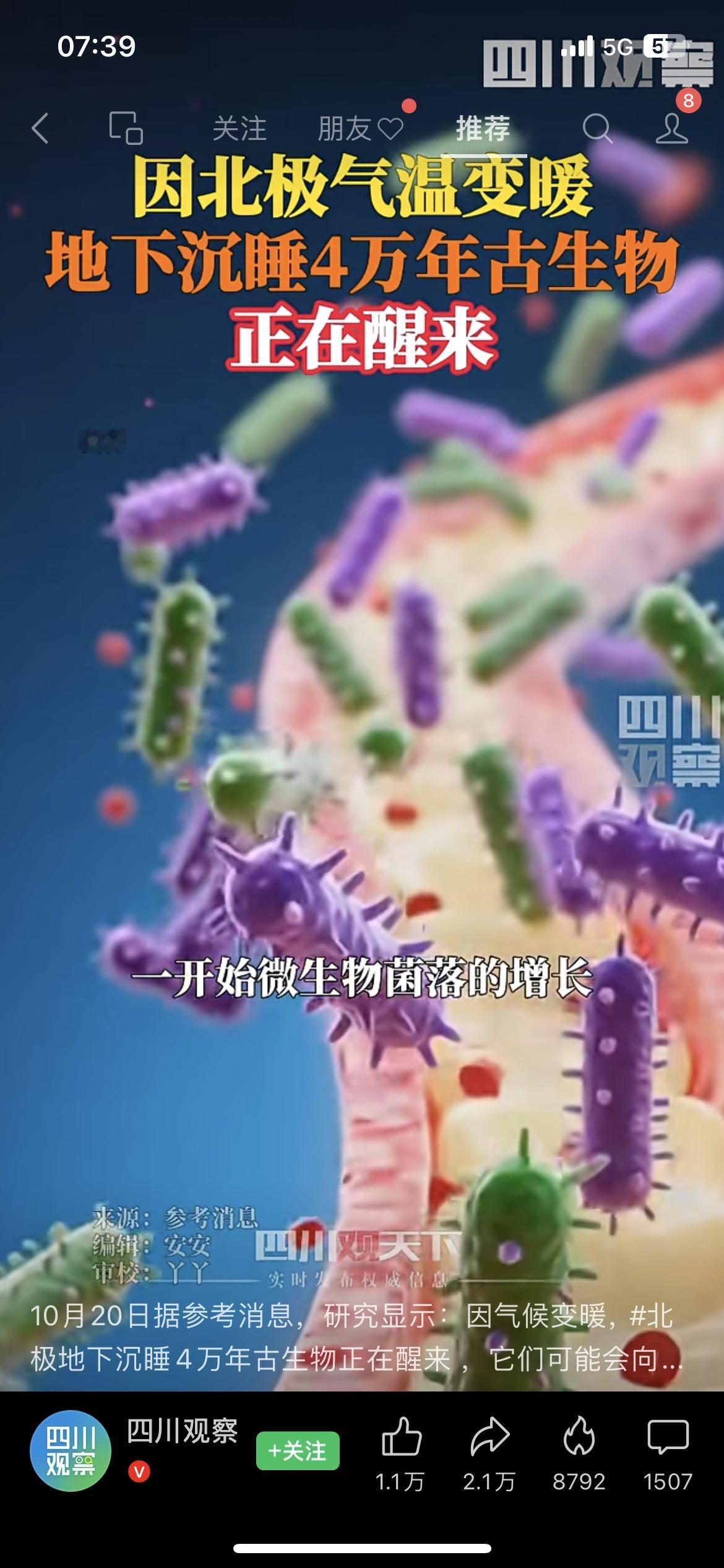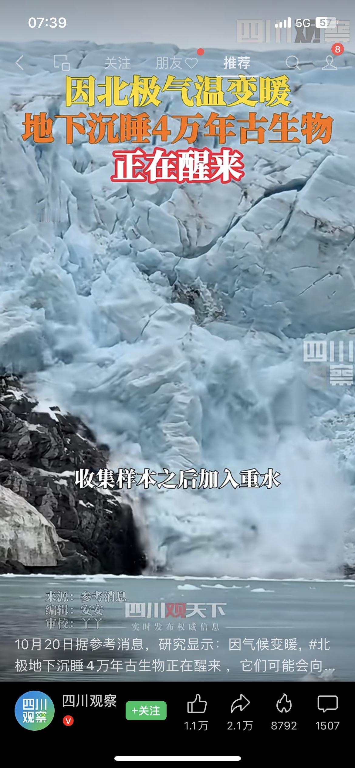 刚刷到个新闻,后背一下就凉了!北极冻土底下,睡了4万年的古生物要“醒”了?】 我刷这消息的时候正扒拉早饭呢,筷子都顿了——北极不是越来越暖嘛?冻土一化,那些在底下沉了4万年的远古生物,现在居然开始慢慢恢复活性了! 听说科学家去阿拉斯加取了样本,加了重水检测后发现,这些远古微生物真的动起来了!不是,这都沉睡了4万年的东西,万一带着没见过的微生物,这风险也太让人犯嘀咕了吧? 以前总觉得“气候变暖”离咱们挺远,现在看这冻土底下的“沉睡者”要醒,突然觉得这事儿好像就在跟前似的。 (你们刷到这消息没?这古生物恢复活性,真会有啥影响不?)北极冰山融化
