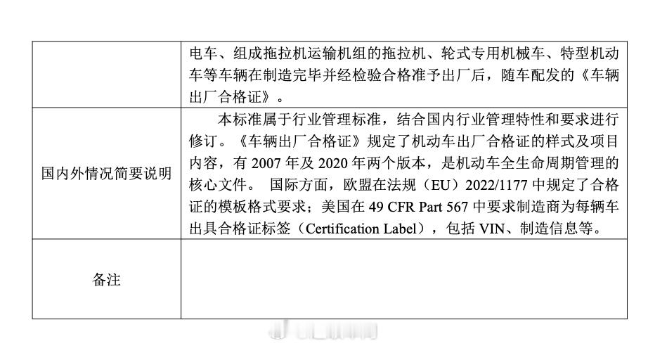 日前,工信部将申请立项的《车辆出厂合格证》强制性国家标准制修订计划项目予以公示,建议书中提到“《车辆出厂合格证》作为机动车出厂合格证明的技术依据,自实施以来发挥了重要作用。然而,面对新能源汽车电池溯源等新需求,现行标准的部分条款需要进行补充及优化,从而去顺应当前行业发展趋势。”