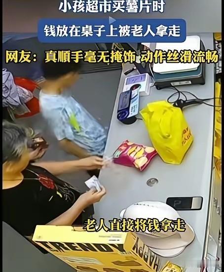 这个老奶奶不讲武德啊! 小男孩把五块钱放在桌子上等老板结算,然后在等待过程中头看向了门外,没想到神奇的一幕发生了。 只见后面的老奶奶眼疾手快,把五块钱拿在手里,还推了一下小男孩让他借过就走了。 回过神的男孩发现钱没了,找了一圈也没看到,这个时候营业员也回来了,他没钱付款把零食放回去了。 这种手足无措百口莫辩的感觉,我小时候也有过,但是我是钱丢了,去小卖部的时候口袋的十块钱掉了。 好在那个老板是熟人,他叫我拿走了以后再来付款,我当时那个无地自容,感觉说自己钱丢了没人信。 回去路上我就找到了,因为在那个地方我手插口袋拔出来时候带出来了,真的是万幸。 所以这个奶奶真的是很无语,五块钱而已,给这个孩子造成了多大的心理压力。