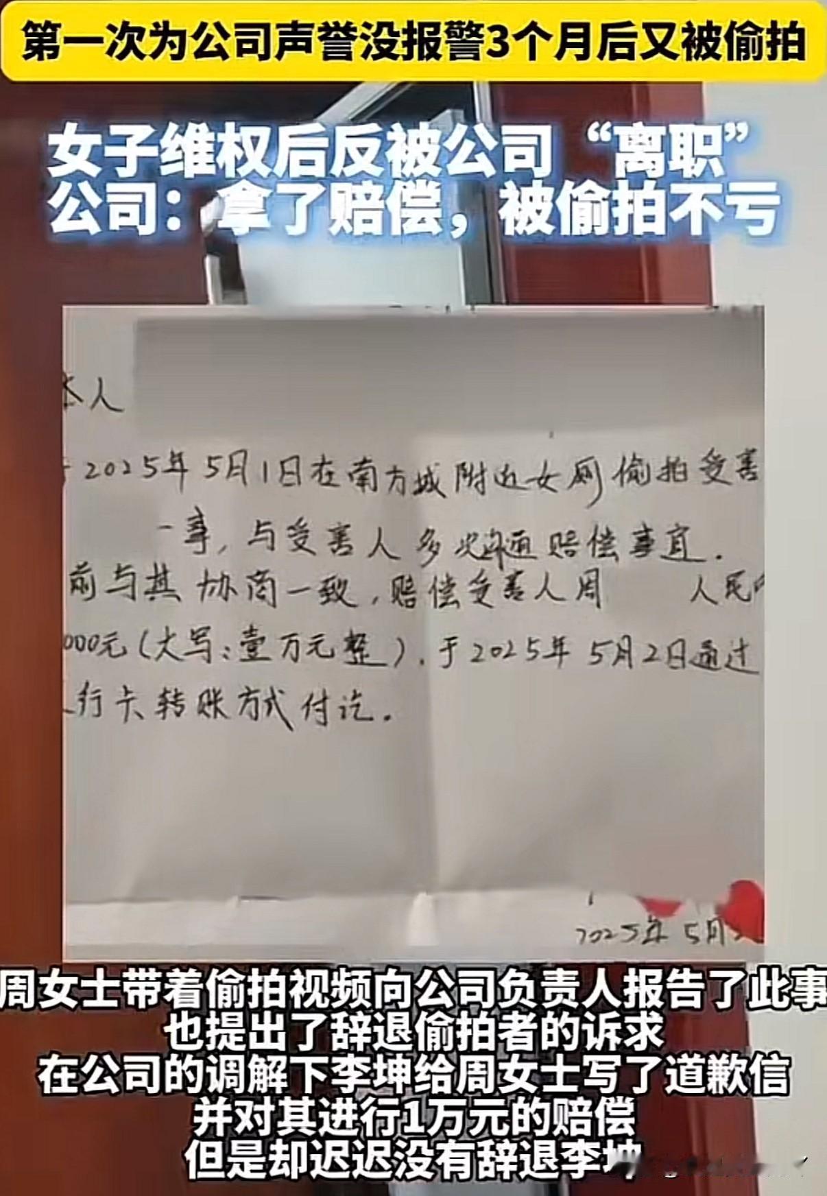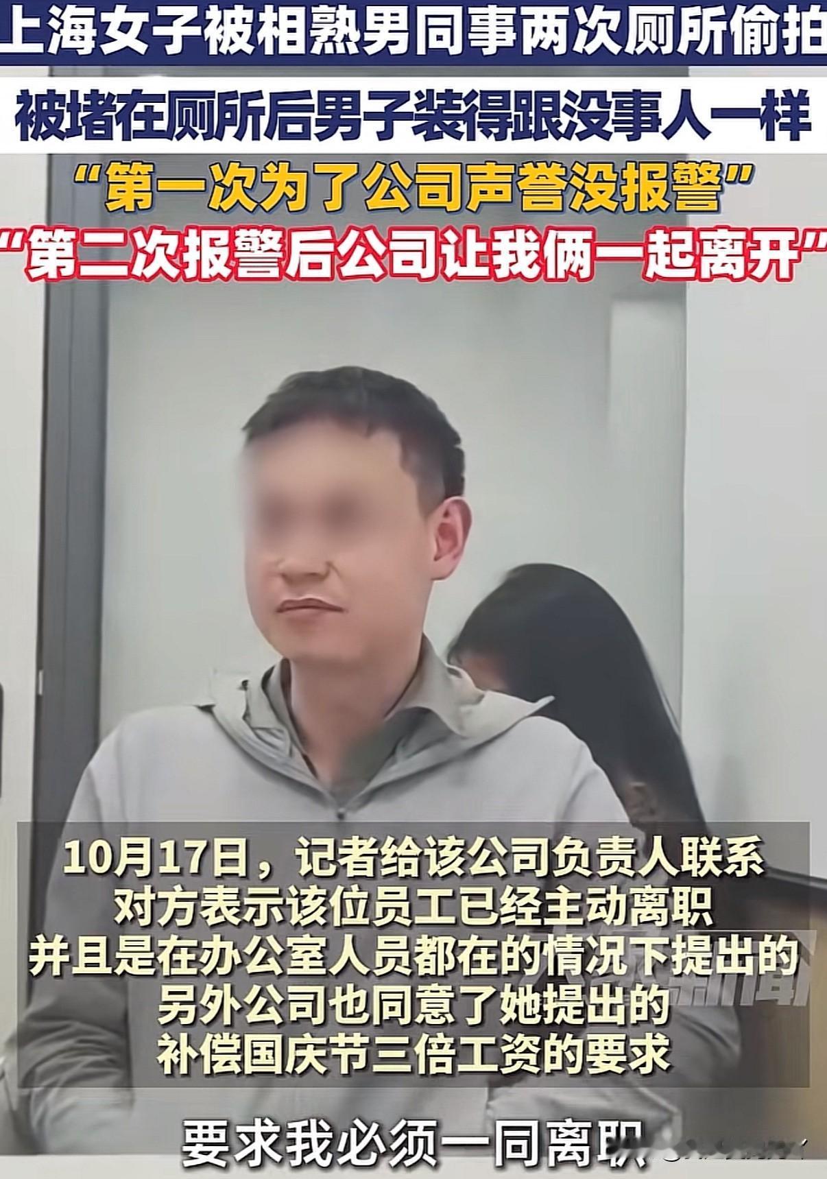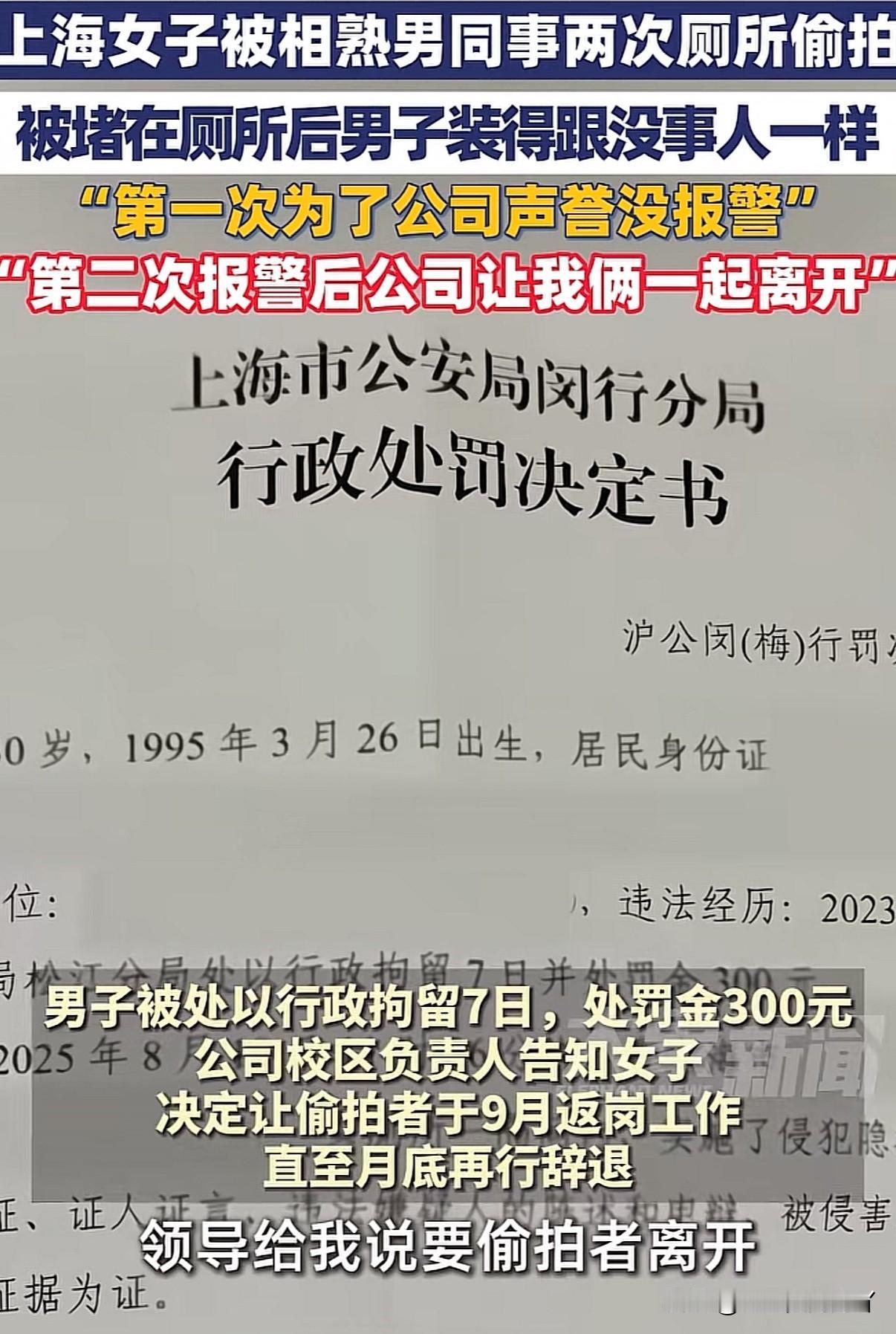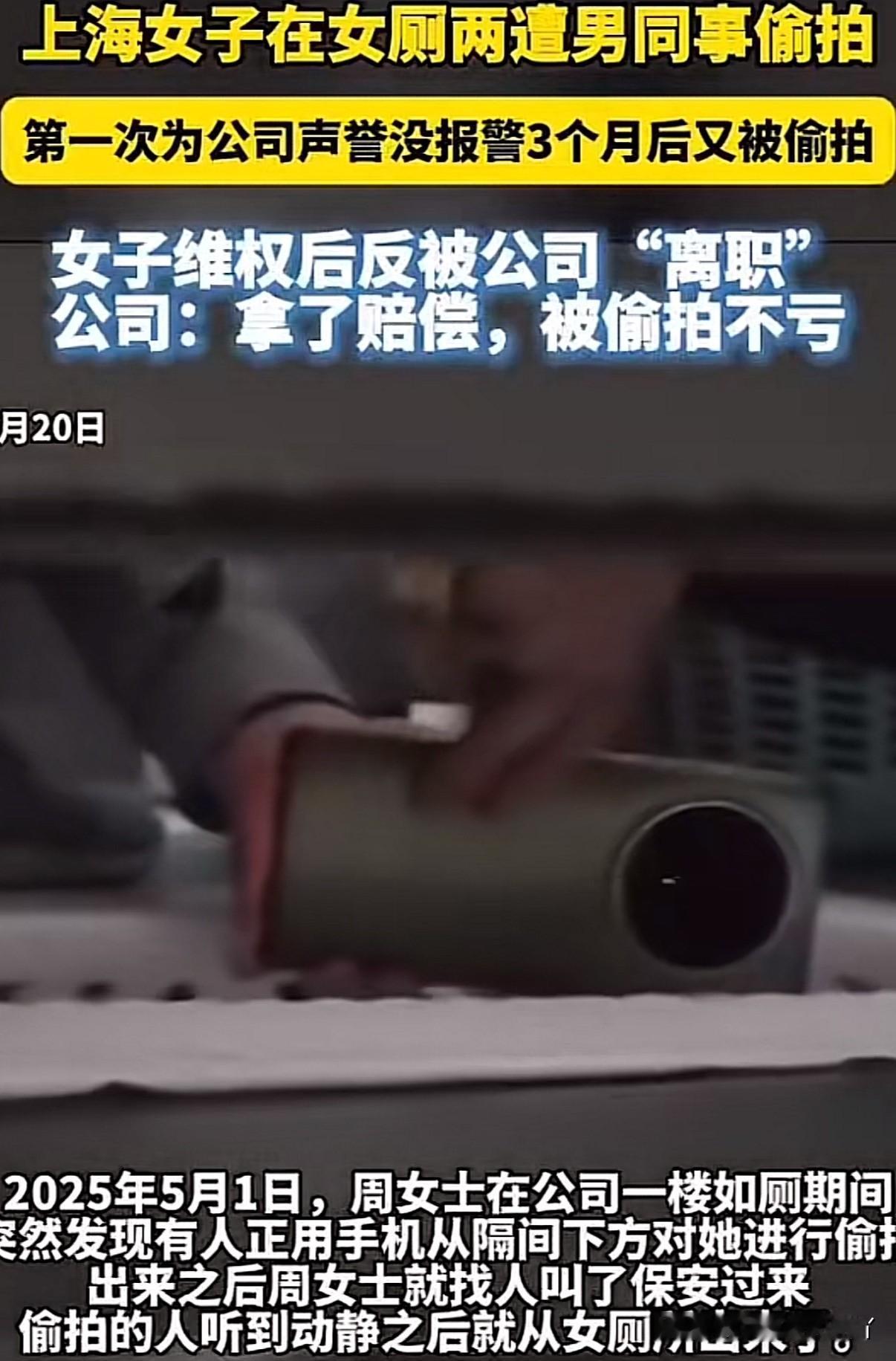 女子在公司厕所两次被男同事偷拍,领导却说:虽然他偷拍不对但也给了你一万块钱的赔偿你不吃亏 上海周女士表示今年5月1号在公司加班上厕所的时发现有人拿手机通过厕所隔间缝隙偷拍,叫来保安把男子堵在厕所后发现居然是同事,因多方考虑男同事也愿意给予1万元赔偿周女士便没有报警追究 今年8月18号男子再次用相同方式在厕所偷拍周女士又被发现,这次周女士表示给再多赔偿都不行坚持报警。第一次被偷拍一是出于保护各方名誉而且男子认错态度也好还承诺不会再犯才没深究选择息事宁人,谁知男子竟不知收敛 周女士报警后男子被处拘留7天、罚300。但让周女士无法接受的是出了这样的事公司仍不开除男子,还让其拘留出来以后正常上班 周女士找到公司要说法,公司领导提出如果一定要让男子离开那么周女士也要一起走,并说出:你已经拿到赔偿了也不吃亏的话 周女士目前已从上海锐思教育自动离职! 信源:大象新闻
