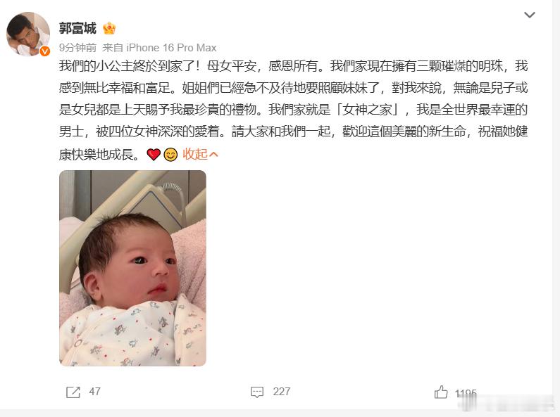 被曝怀三胎的时候其实都怀孕几个月了,很快临产。前些日子就说生完了,结果最近在官宣。之前都说是儿子,结果郭富城官宣还是女儿。虽然更期待儿子,但生男生女也是顺其自然,应该都很珍惜,老来得女更开心。