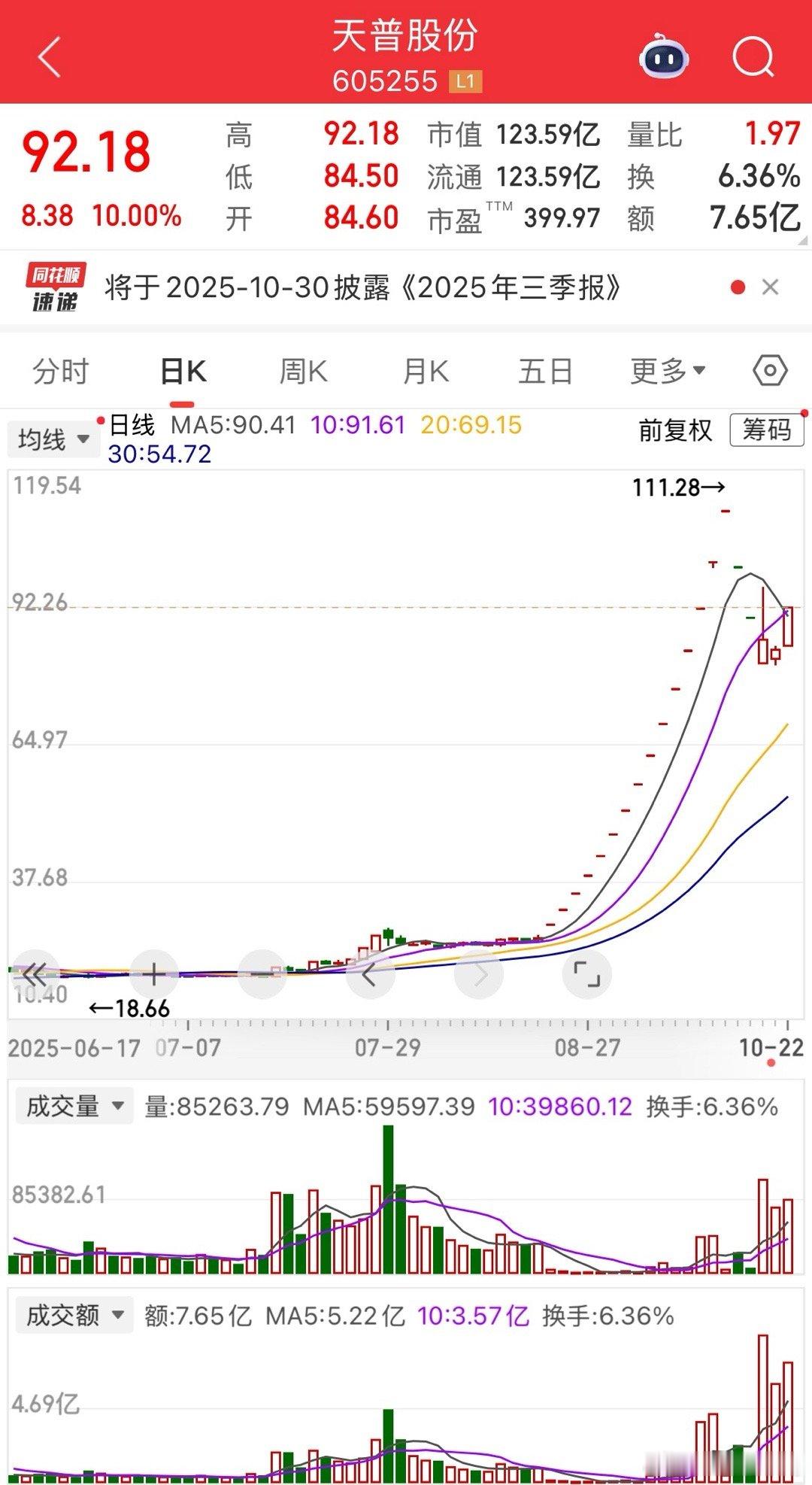 天普股份9月连着停牌3次核查,堪称A股“停牌专业户”,结果每次复牌都接着疯涨,之前还走出过15连板的狠行情。最近复牌后调整了4天,本以为要“刹车”,结果今天又涨停了,股价一路飙到92块多。明明主业是汽车管路,却靠AI芯片重组预期疯涨,市盈率都飙到几百倍了。