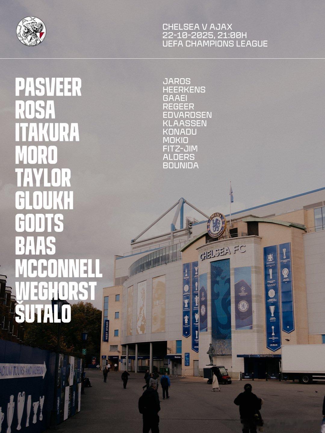 阿贾克斯首发:22-帕斯维尔、37-苏塔洛、4-板仓滉、15-尤里·巴斯、2-卢卡斯·罗萨、8-泰勒、10-格洛赫、16-麦康奈尔、11-米卡·霍茨、7-劳尔·莫罗、25-韦霍斯特