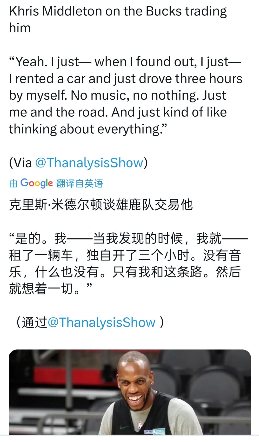 ☞米德尔顿谈雄鹿当初交易他:额,就是当初我发现这事的时候,我就租了一辆车,独自在路上开了三个小时,也没开音乐什么的,就默默的开着,然后思考这一切