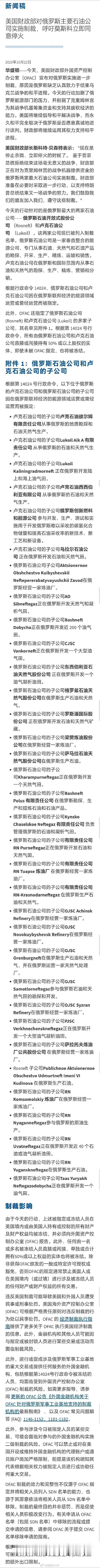 美国财政部宣布对俄罗斯最大的两家石油公司——俄罗斯石油公司和卢克石油公司以及子公司实施制裁,理由是俄罗斯没有认真致力于结束乌克兰战争的和平进程。