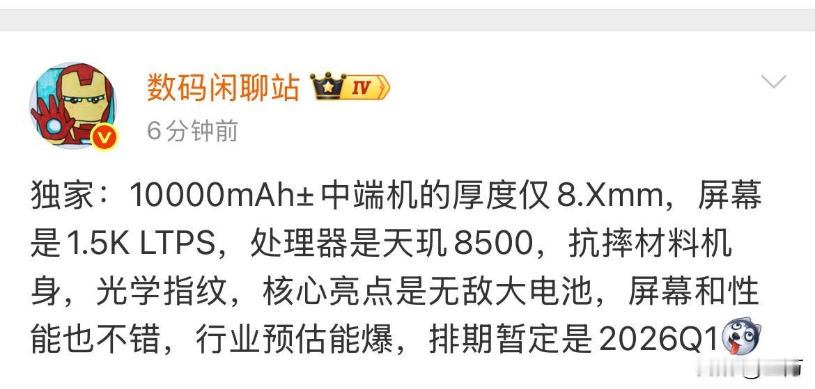 数码闲聊站:明年一季度,会有一款10,000毫安的手机出来[捂脸] 就在刚才,数码闲聊站在社交网络上放出了一款手机的消息! 看看他的配置:10000mAh±中端机的厚度仅8.Xmm,而且还加上1.5K LTPS的屏幕,再加上天玑8500处理器! 这还不够,全身使用了抗摔材料机身,而且还上了光学指纹,所以他这并不是一款老年机,而是一个真正的信能机器! 但是他的亮点就是电池太大了,甚至有可能会超过10,000毫安[捂脸],你这个东西应该就不用带充电宝了,而且大概率明年一季度就会上! 那按照日期来算,还有两个多月的时间,大家就能够看到这个手机了,但是他自始至终都没有说是哪个品牌,可是在他的评论区,大家都已经猜到了,你以为是哪个牌子,居然敢这么做[捂脸]